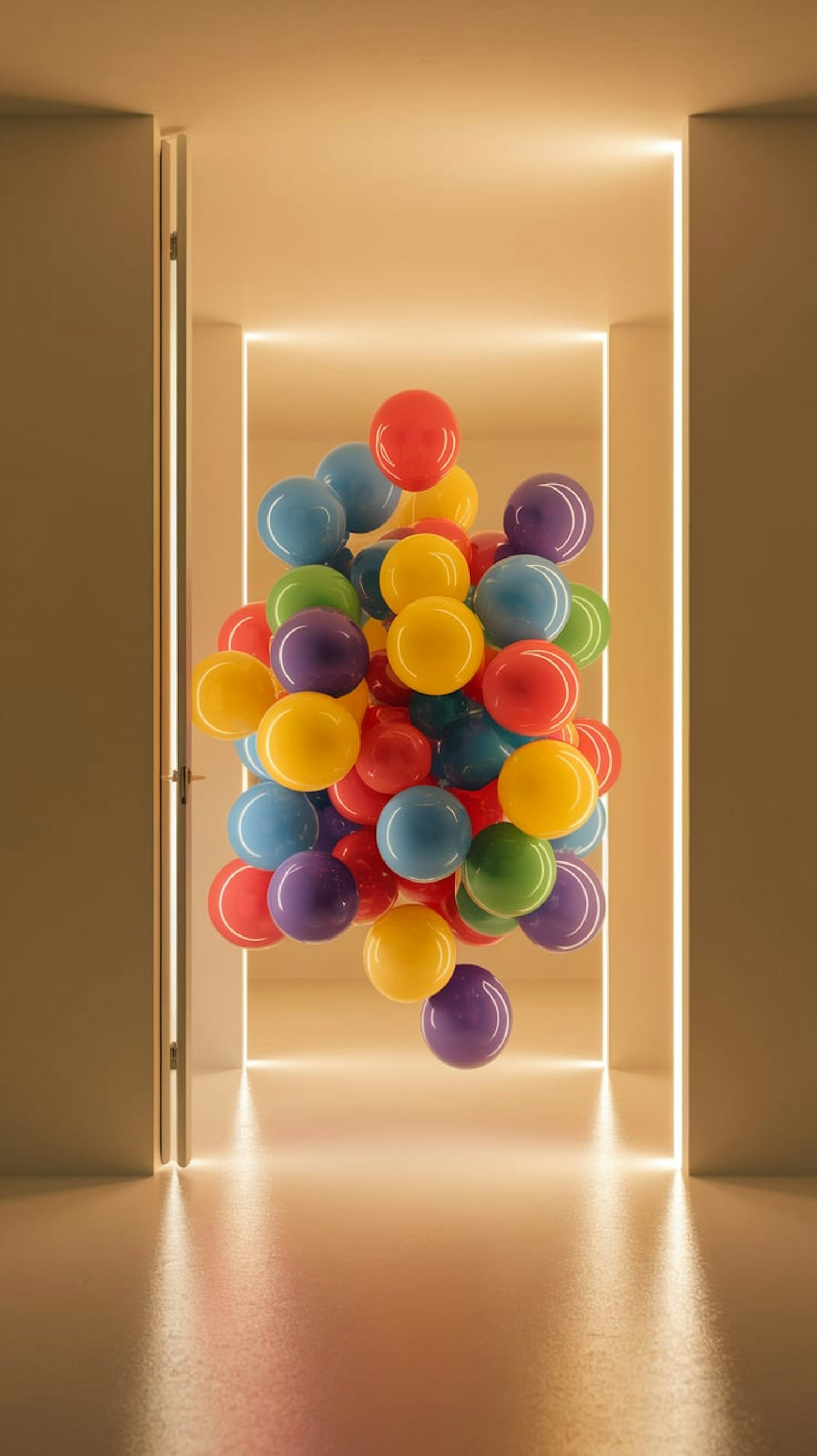 A cluster of colorful balloons floats in a modern, warmly lit room with sleek LED lighting and a minimalistic design.