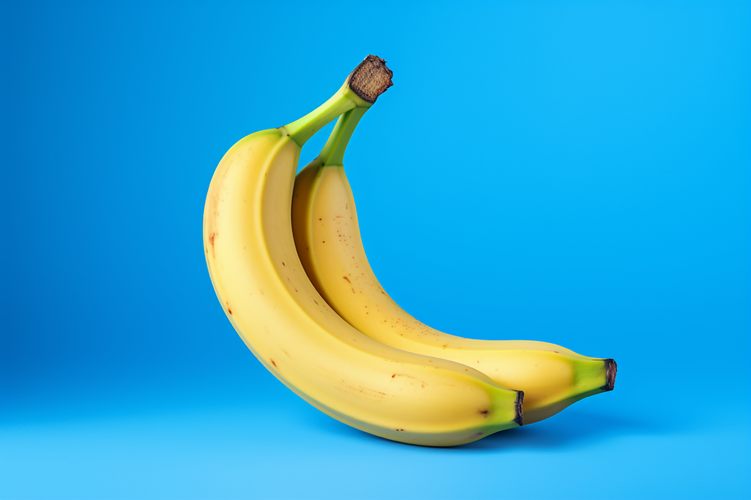 Two ripe bananas against a vibrant blue background, showcasing their bright yellow color and smooth texture.