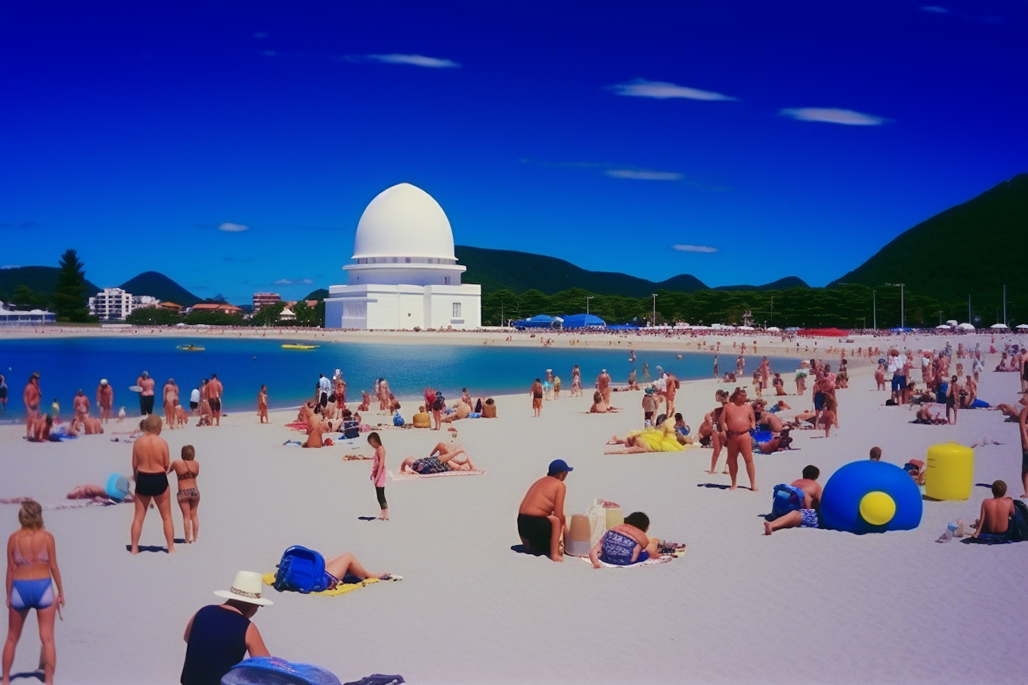 Crowded beach with sunbathers and a striking white dome building under a clear blue sky.
