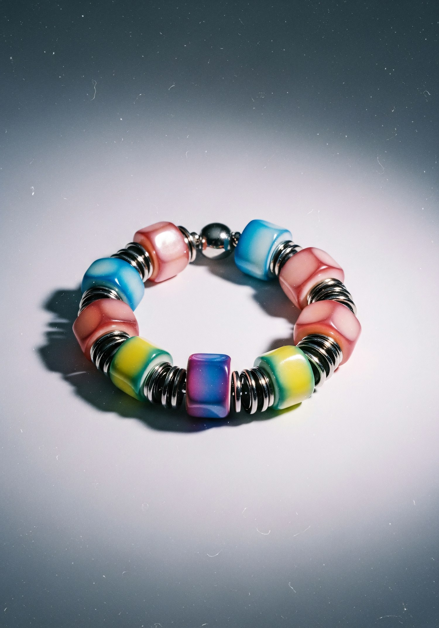 A vibrant bracelet with colorful square beads and metallic accents, arranged in a circular pattern on a softly lit background.
