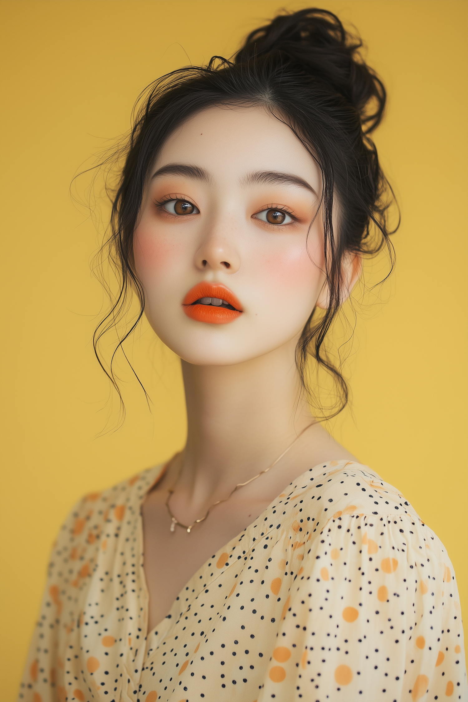 Stylish portrait of a young woman with vibrant makeup, polka dot blouse, and a yellow background. Perfect for beauty or fashion inspiration.