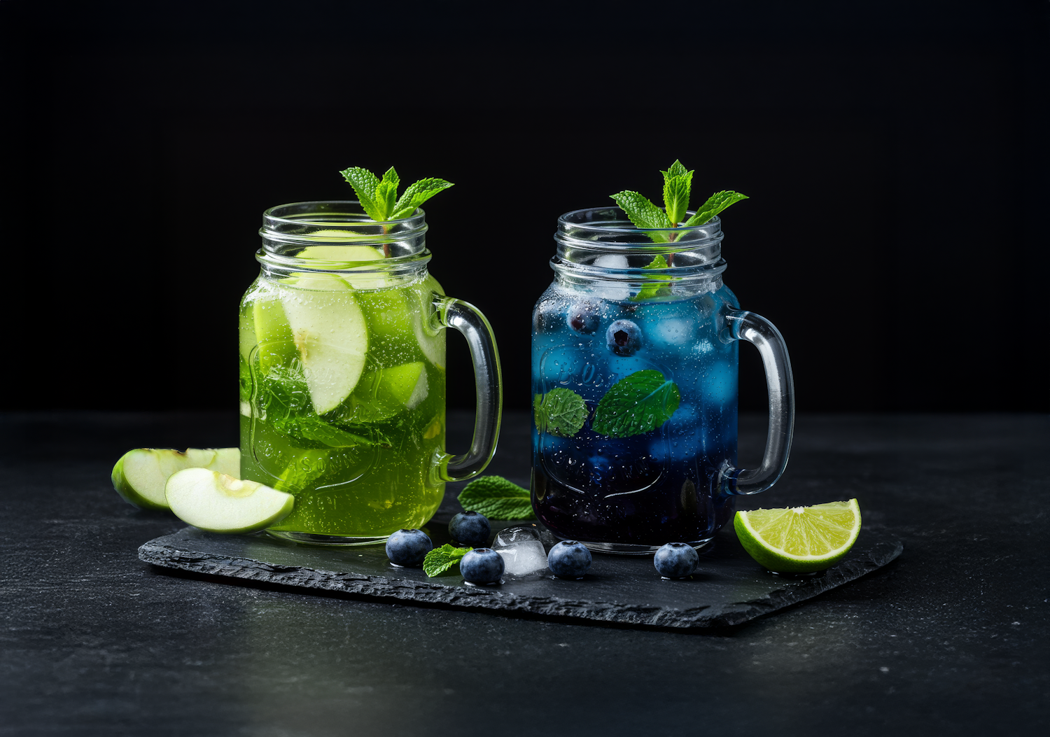 Refreshing green apple and blueberry sodas in mason jars, garnished with mint, surrounded by fresh fruit on a dark slate surface.