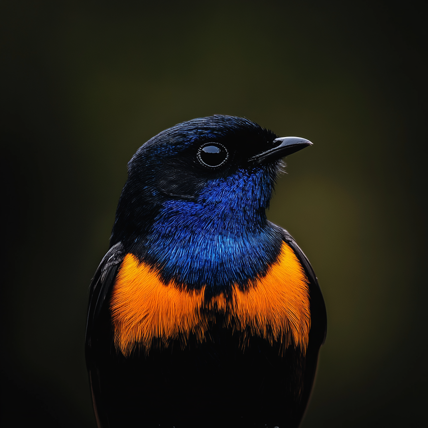 Vibrant bird with deep blue and bright orange plumage against a dark background, showcasing striking contrast and vivid colors.