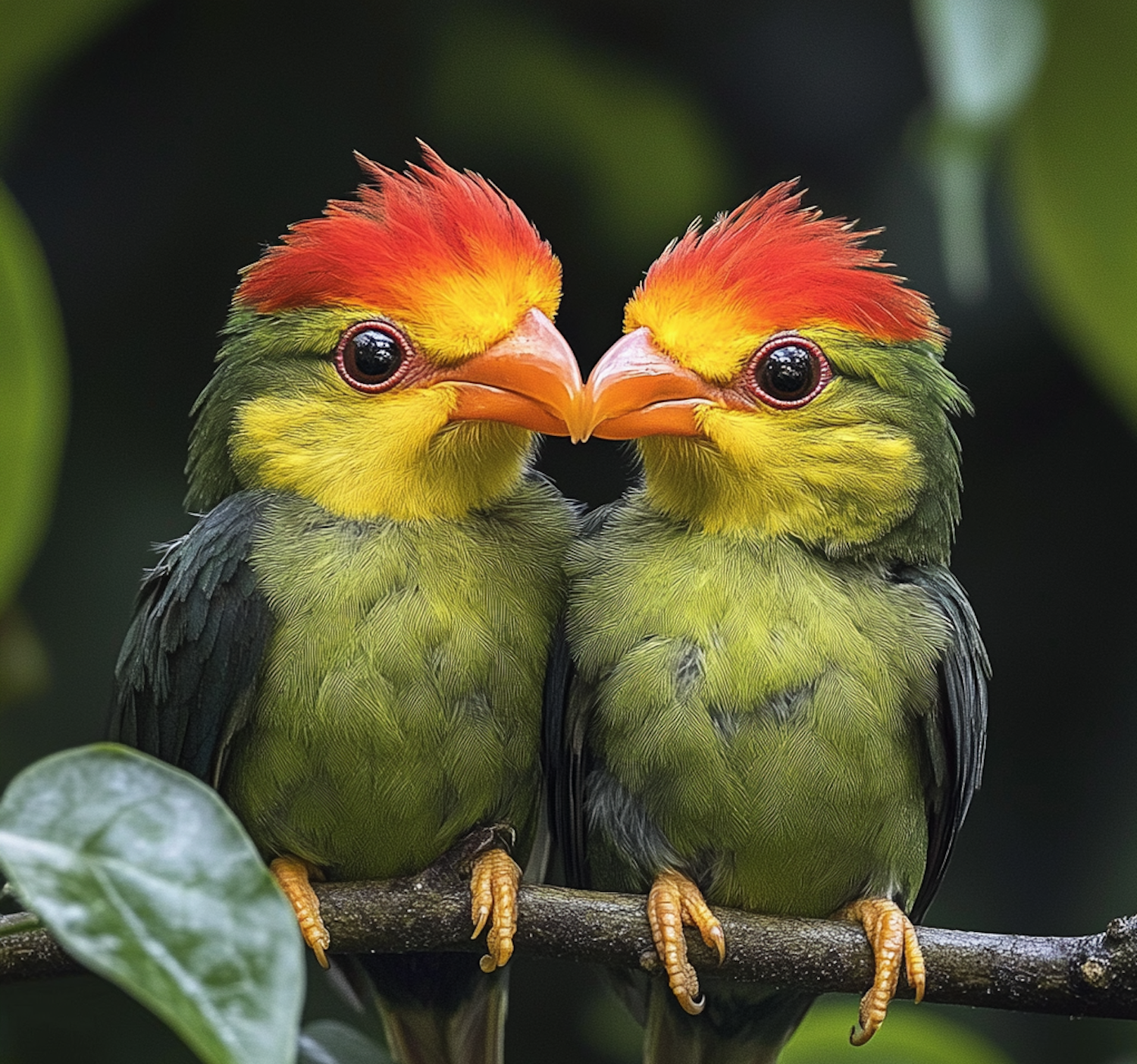 Two colorful birds with red crests and orange beaks perched closely on a branch, surrounded by lush green foliage.