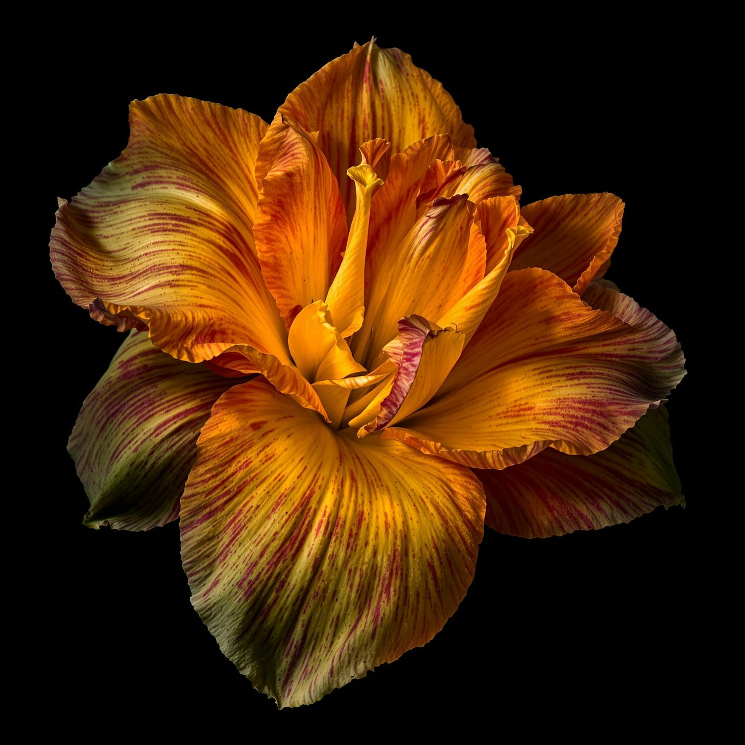 Close-up of a vibrant yellow and orange flower with red streaks, set against a black background, showcasing intricate petal details.