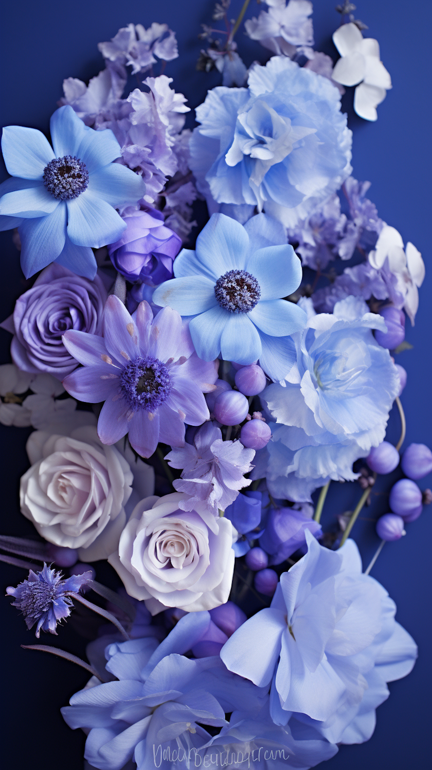 Elegant floral arrangement in shades of blue and purple, featuring roses and anemones against a dark blue background.