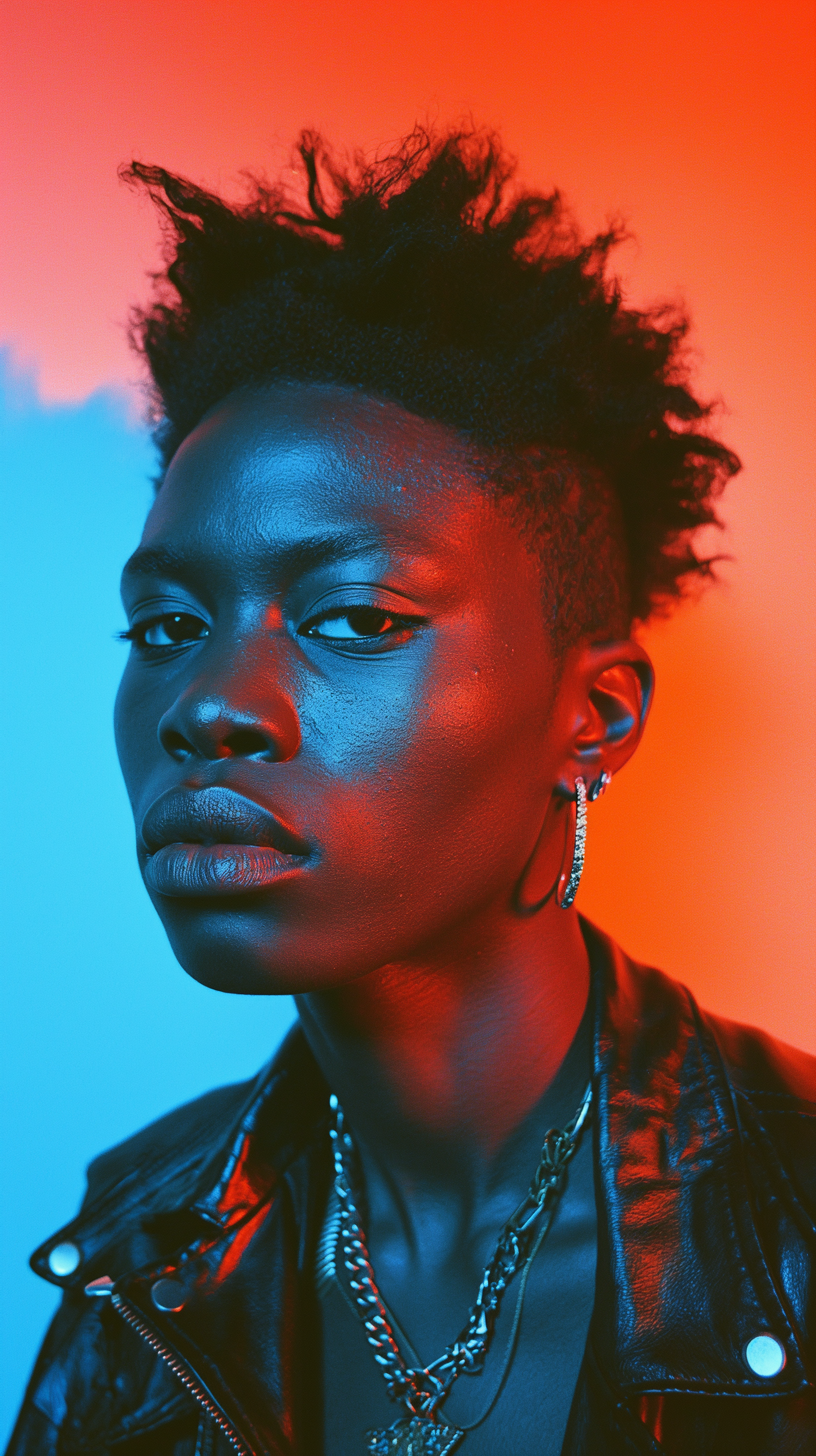 Bold portrait with dramatic blue and red lighting, featuring a confident individual in a leather jacket and silver chains.