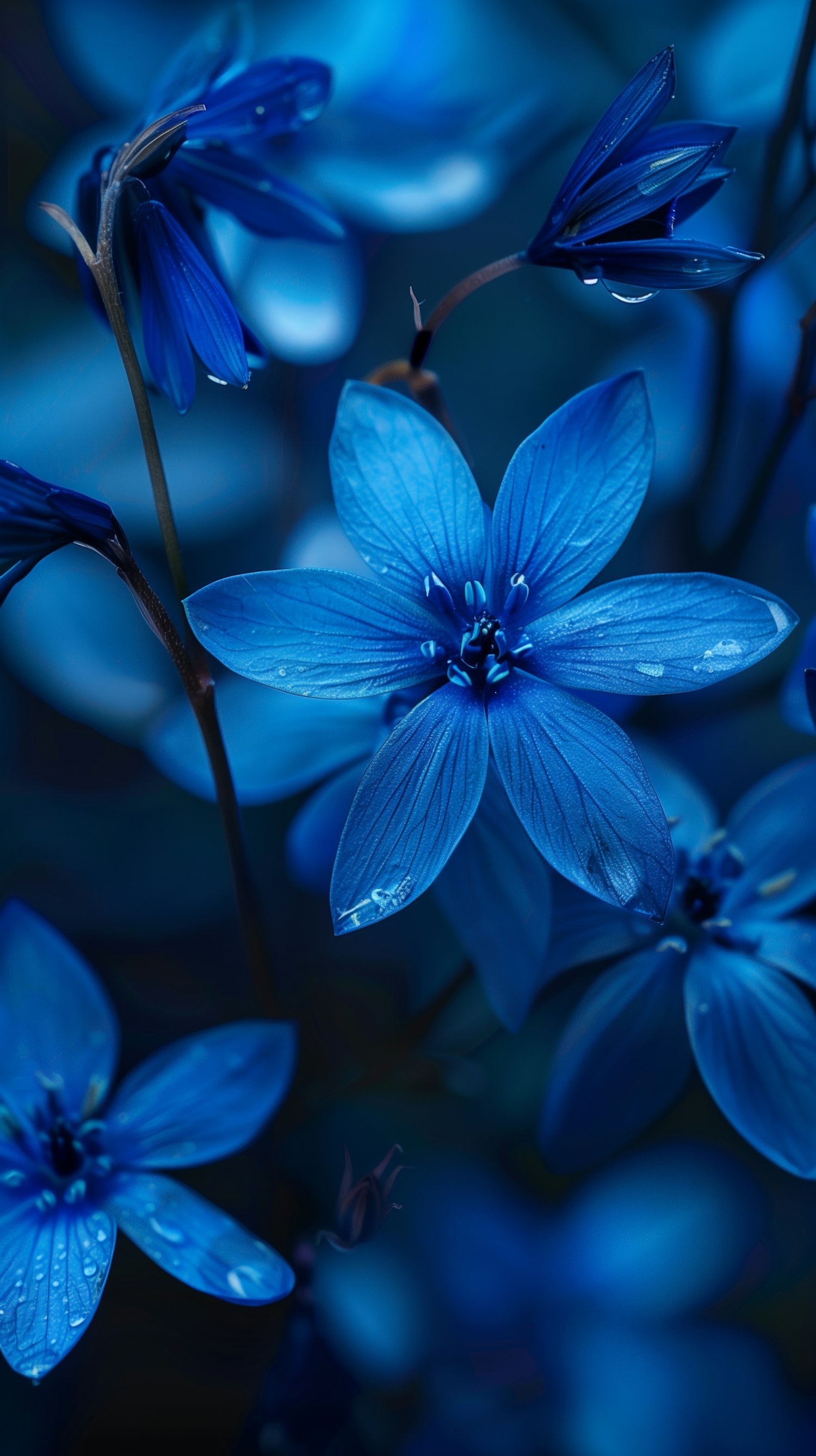 Close-up of vibrant blue flowers with water droplets, showcasing intricate petal details and a serene blue color palette.
