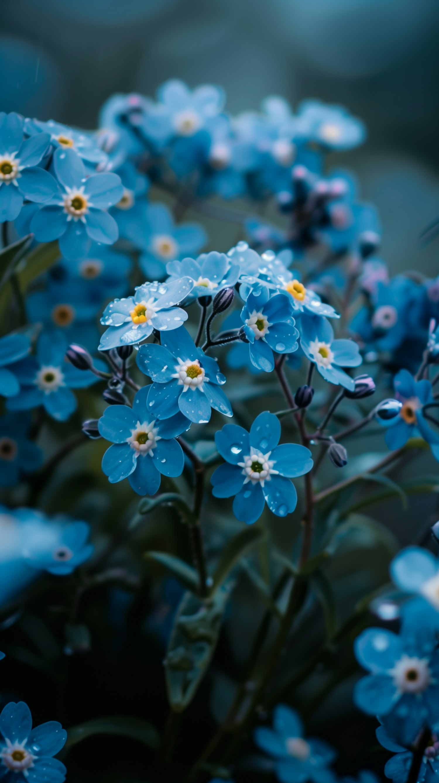 Close-up of blue forget-me-not flowers with water droplets, highlighting their delicate beauty and vibrant colors.