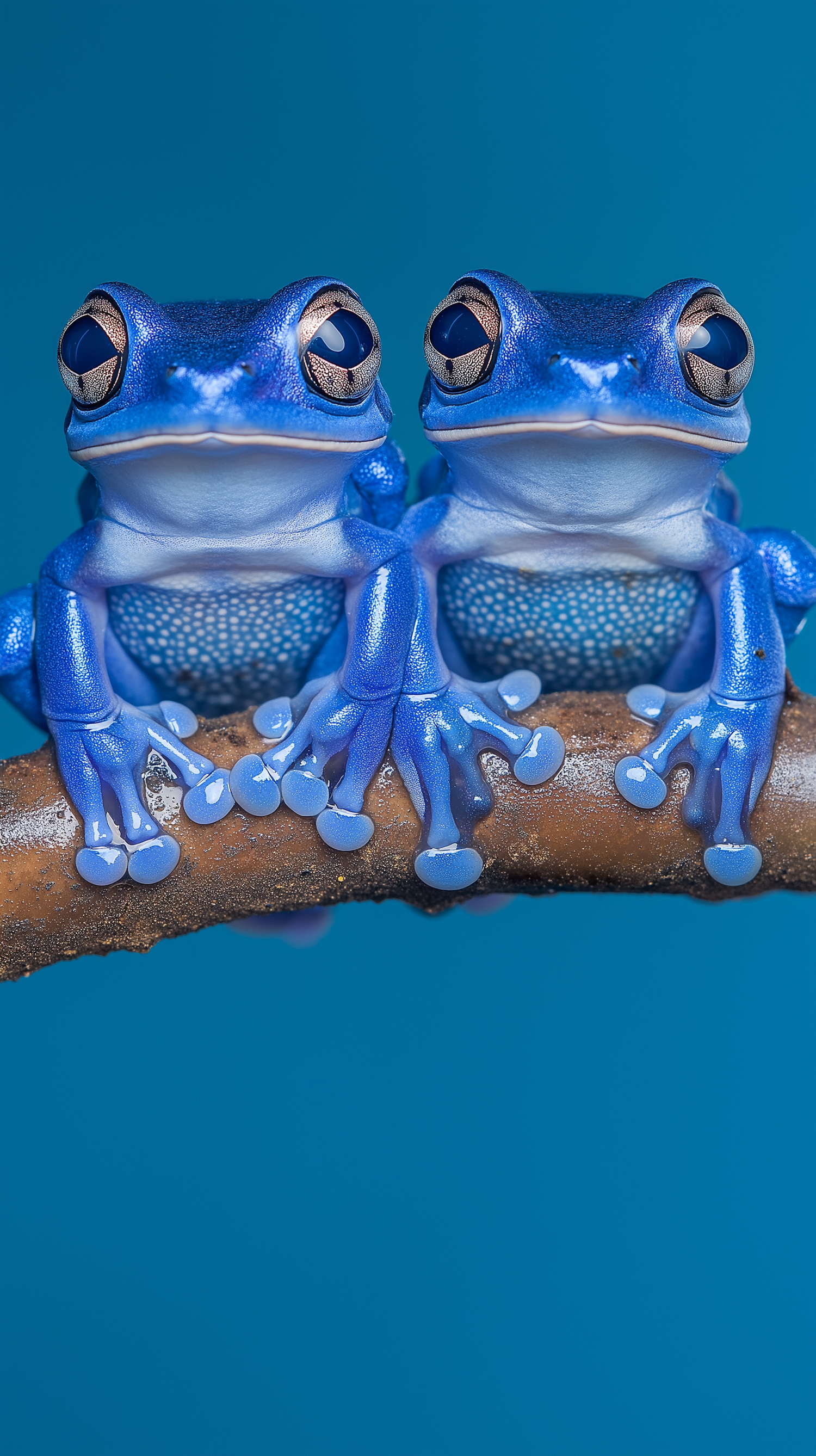 Two vibrant blue frogs perched on a branch against a blue background, showcasing their striking color and curious expressions.