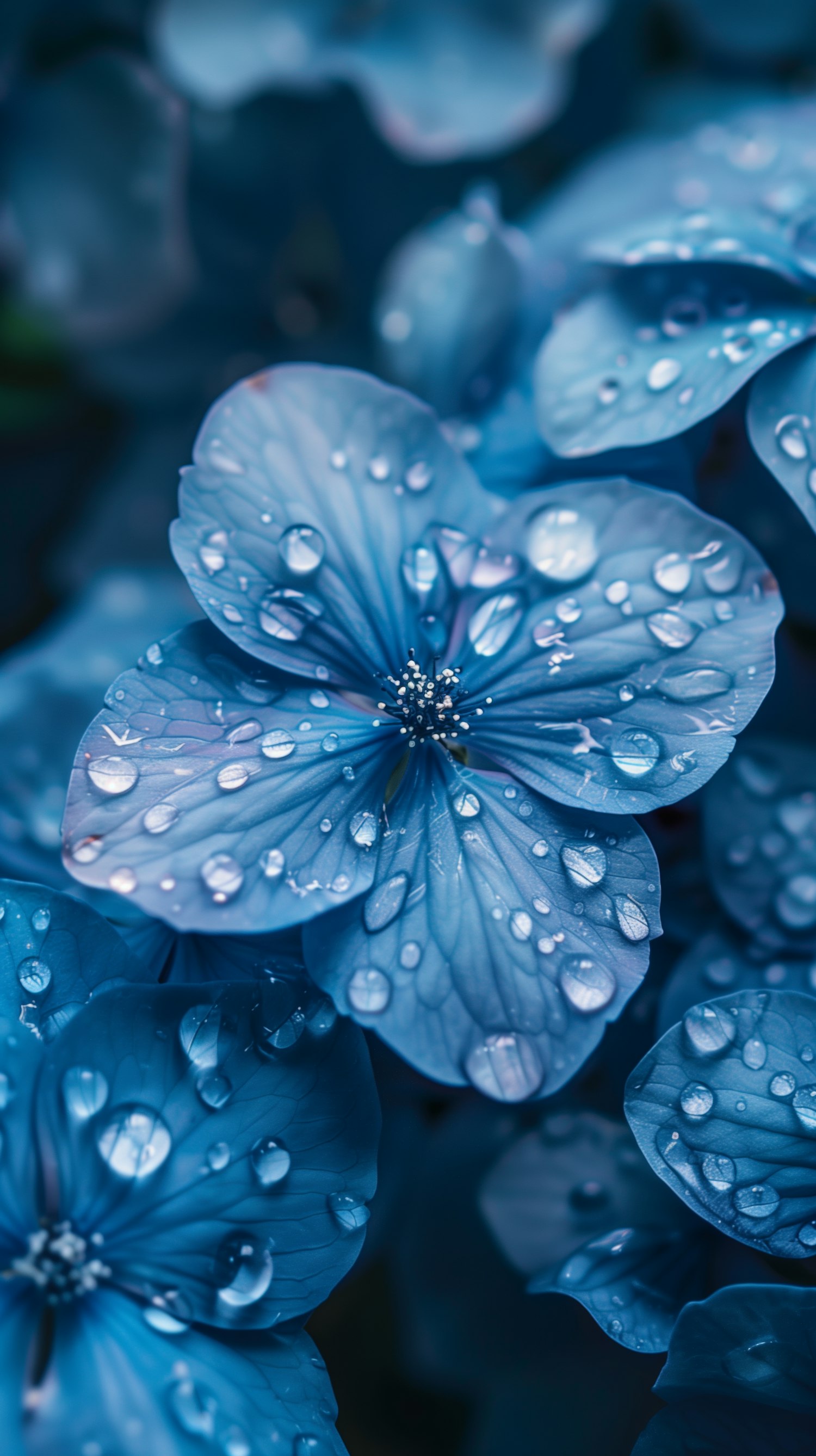 Close-up of a blue flower with water droplets on petals, showcasing intricate details and vibrant colors.