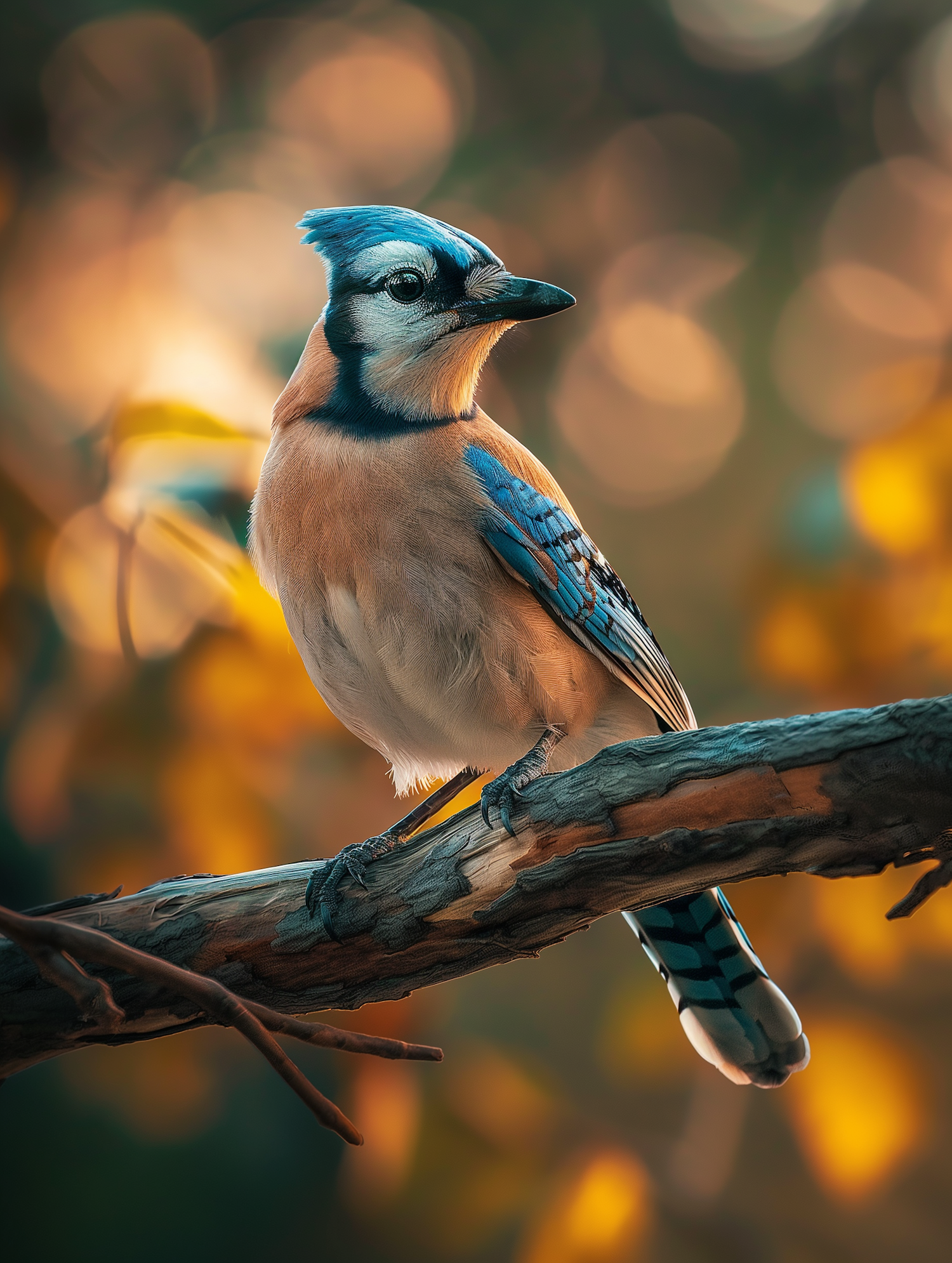 A blue jay perched on a branch with a warm, bokeh background of autumn colors, showcasing its vibrant blue and white plumage.