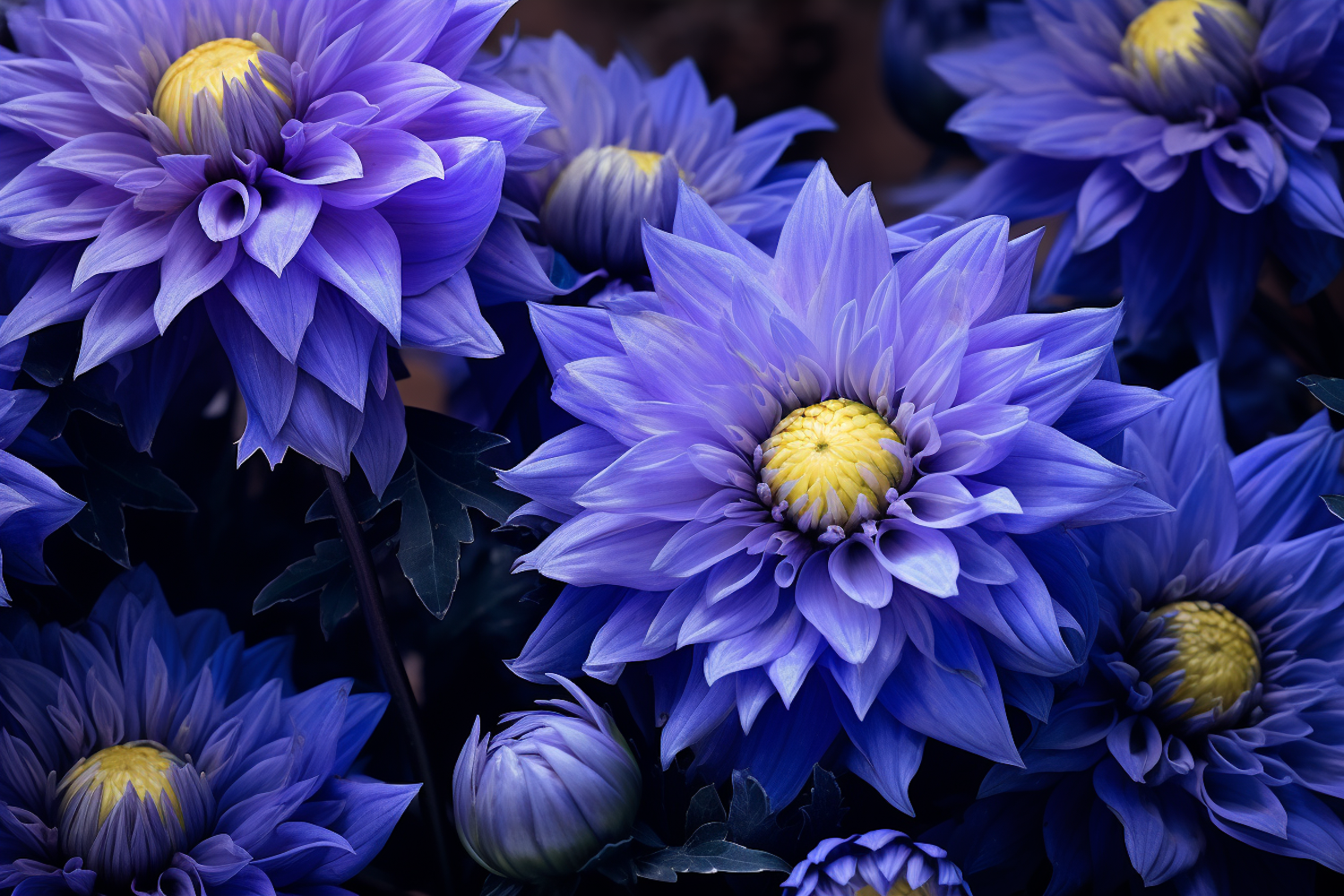 Vibrant blue flowers with layered petals and yellow centers, surrounded by lush green leaves, create a striking and colorful scene.
