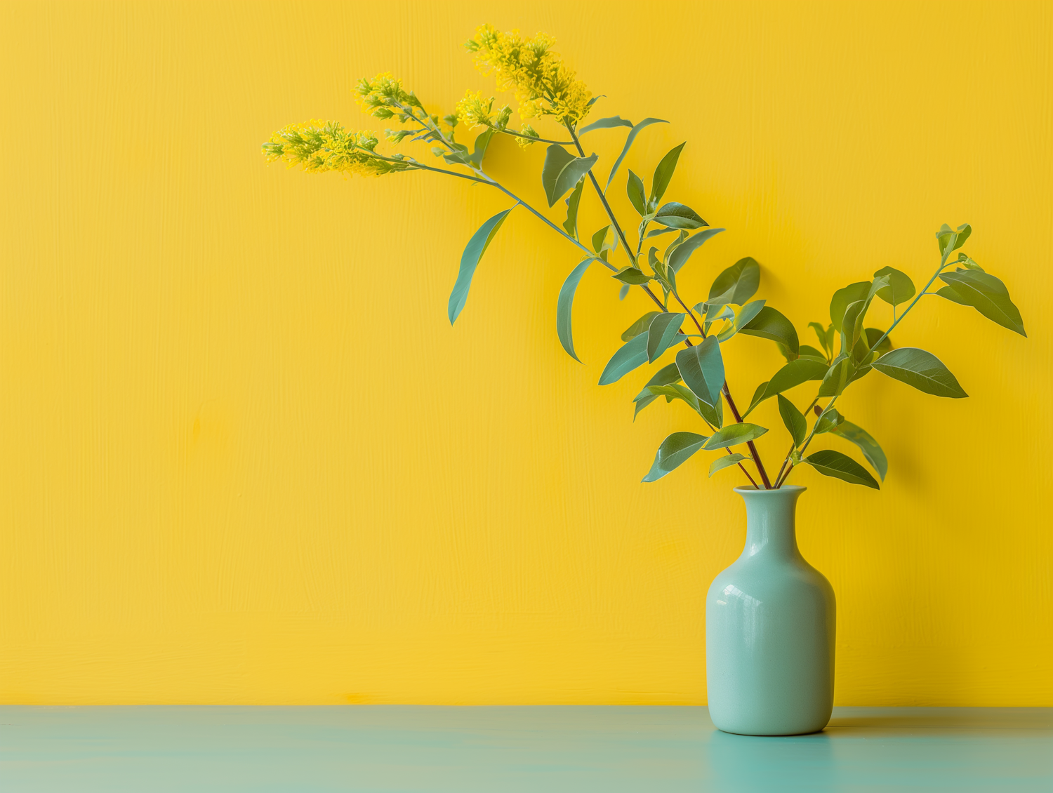 Minimalistic scene with a light green vase and yellow flowers against a vibrant yellow background, creating a cheerful and harmonious composition.