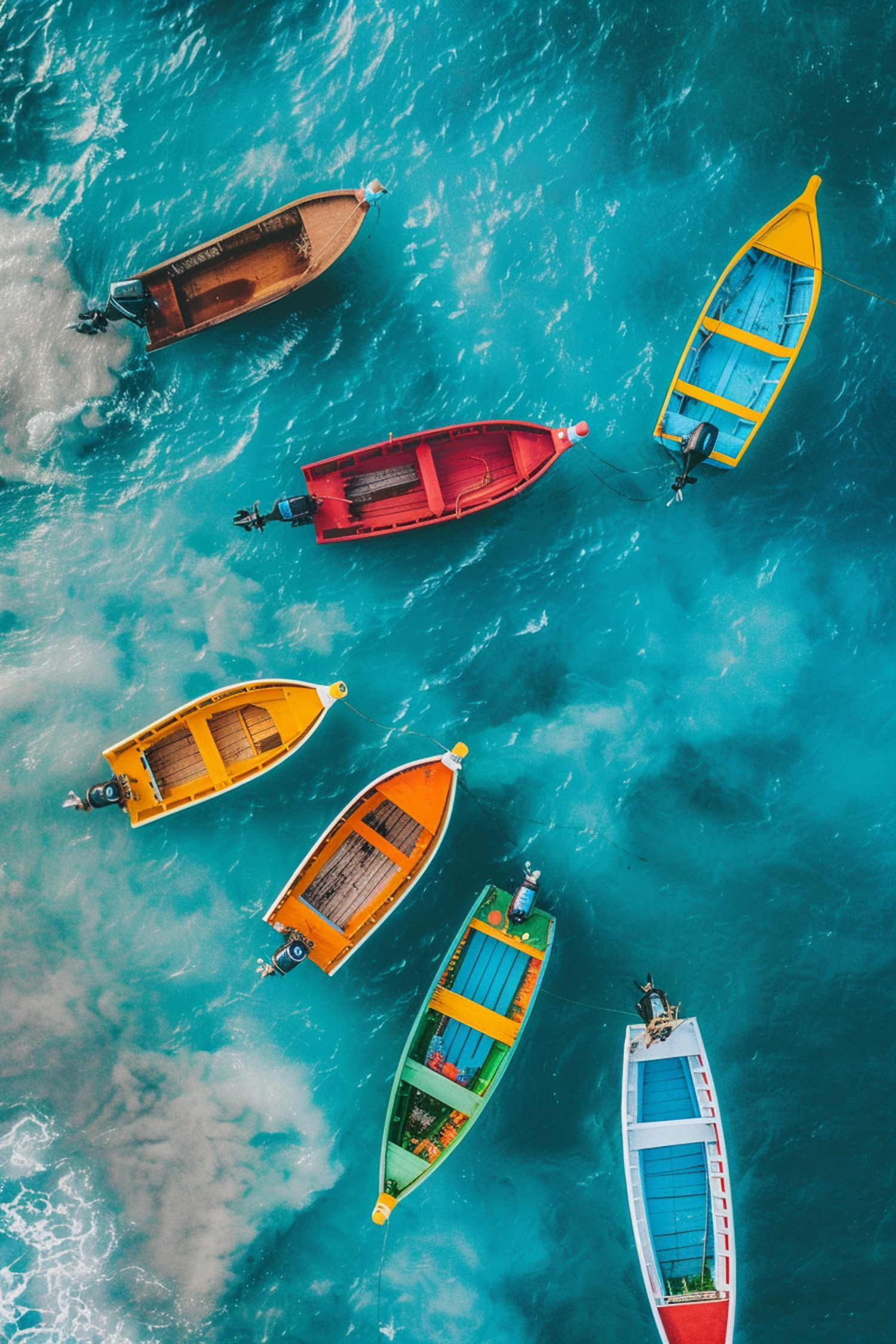 Aerial view of colorful boats on turquoise water, showcasing vibrant hues and a harmonious composition.