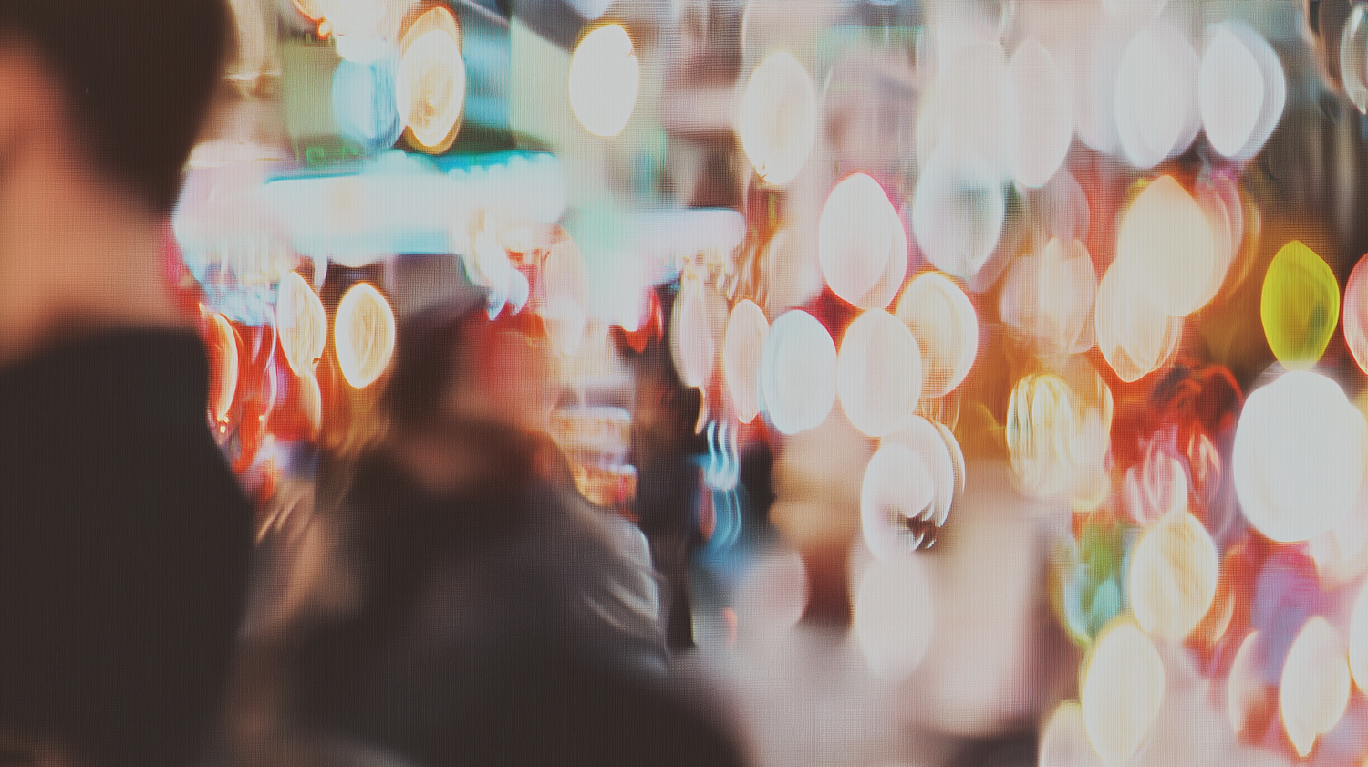 Abstract bokeh lights in vibrant colors with a blurred silhouette in the foreground, evoking a lively urban nightlife vibe.
