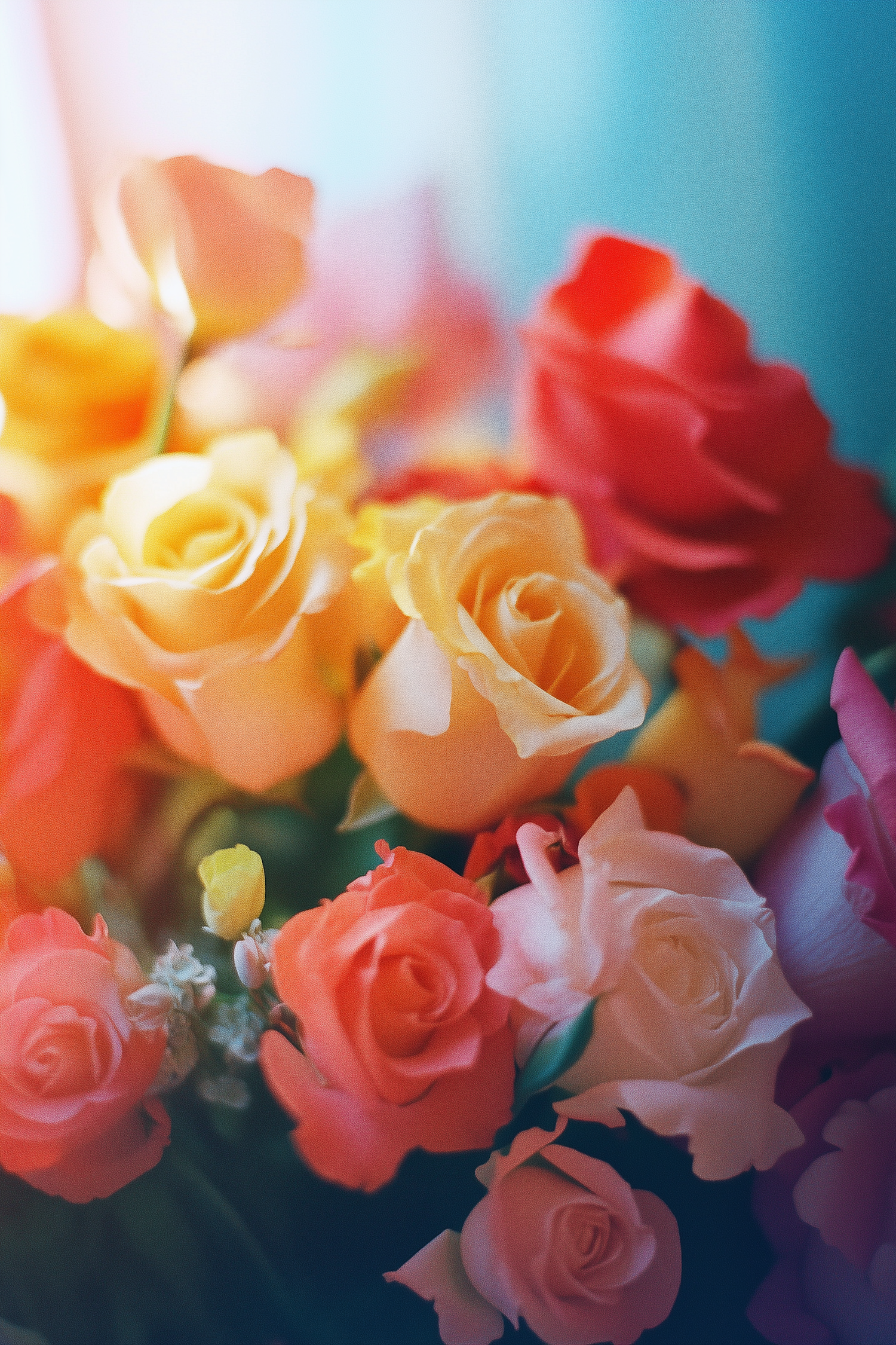 A vibrant bouquet of yellow, pink, and red roses with a soft, dreamy background, exuding warmth and elegance.