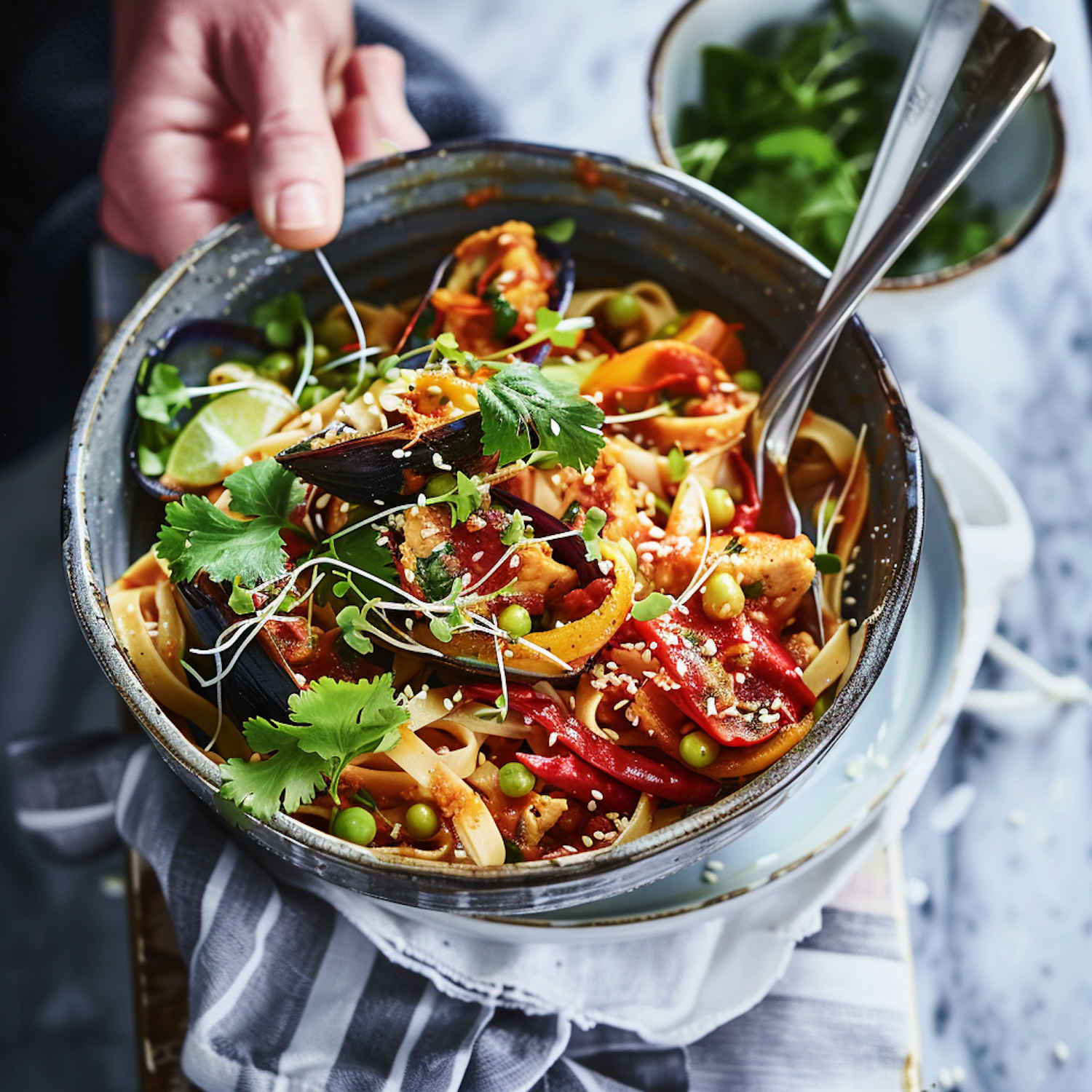 Colorful pasta dish with mussels, bell peppers, peas, cilantro, and lime in a rustic bowl, garnished with sesame seeds and microgreens.