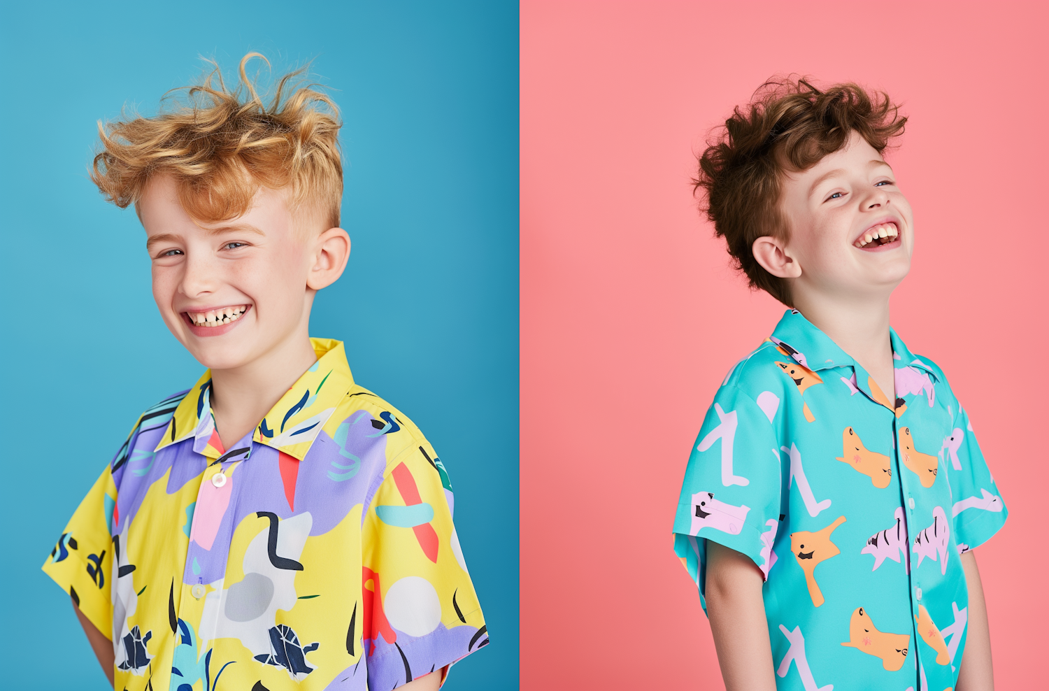 Two boys in vibrant patterned shirts, one on a blue background and the other on pink, radiating joy and playful energy.