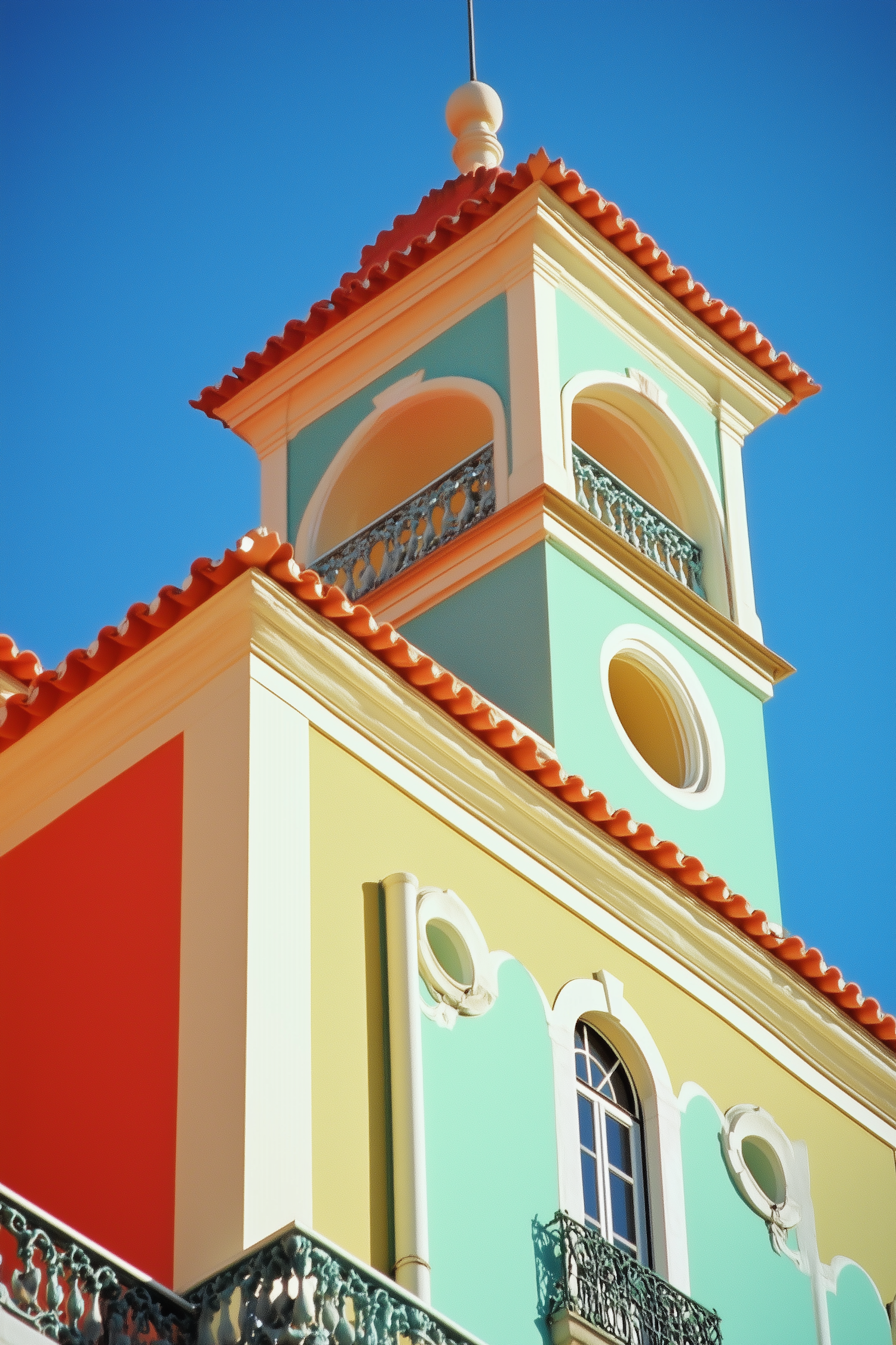 Colorful building with red-tiled roof and pastel walls against a clear blue sky, featuring decorative ironwork and arched windows.