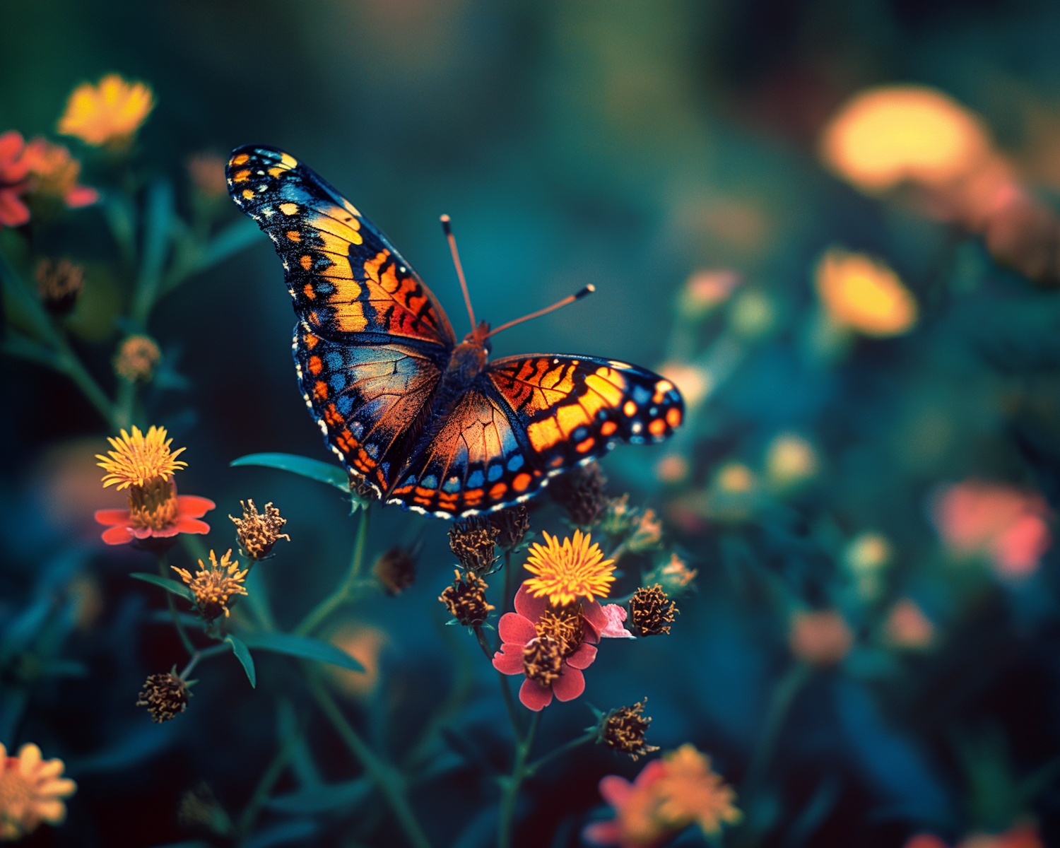 Vibrant butterfly with orange and black wings on colorful flowers, set against a dreamy, blurred background.