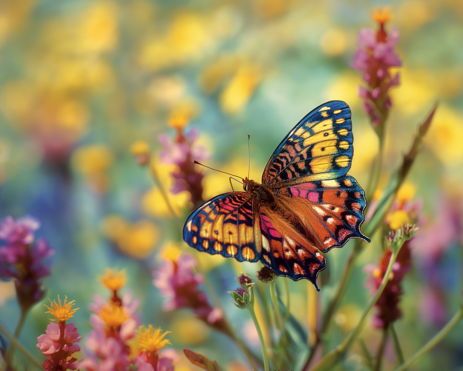 Colorful butterfly with vibrant wings on a flower, surrounded by a dreamy floral background in soft focus.