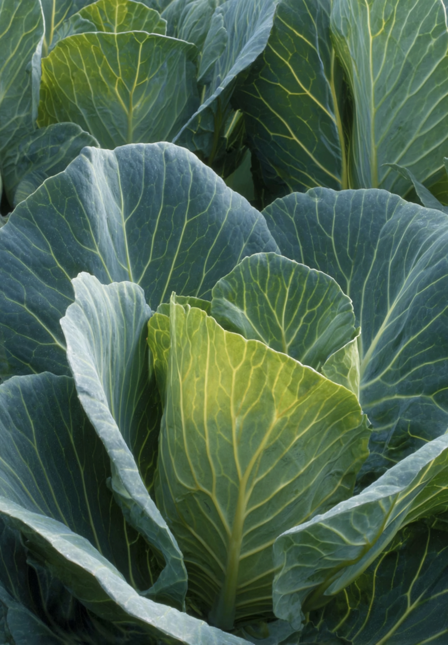 Close-up of a vibrant green cabbage plant with detailed veined leaves, illuminated by soft natural light, showcasing its natural beauty.