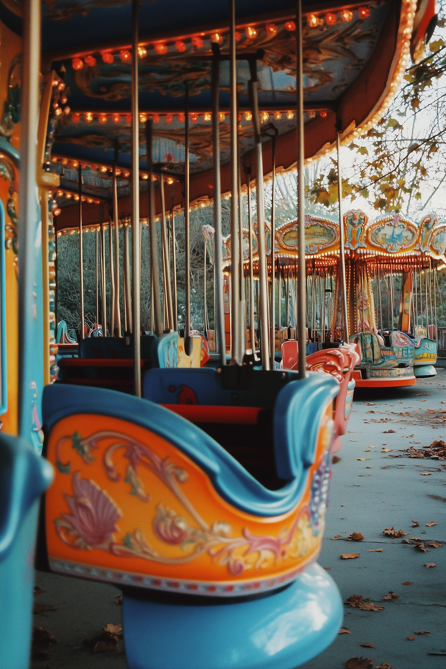 Colorful carousel with intricate patterns and glowing lights, set in an autumn scene with fallen leaves on the ground.