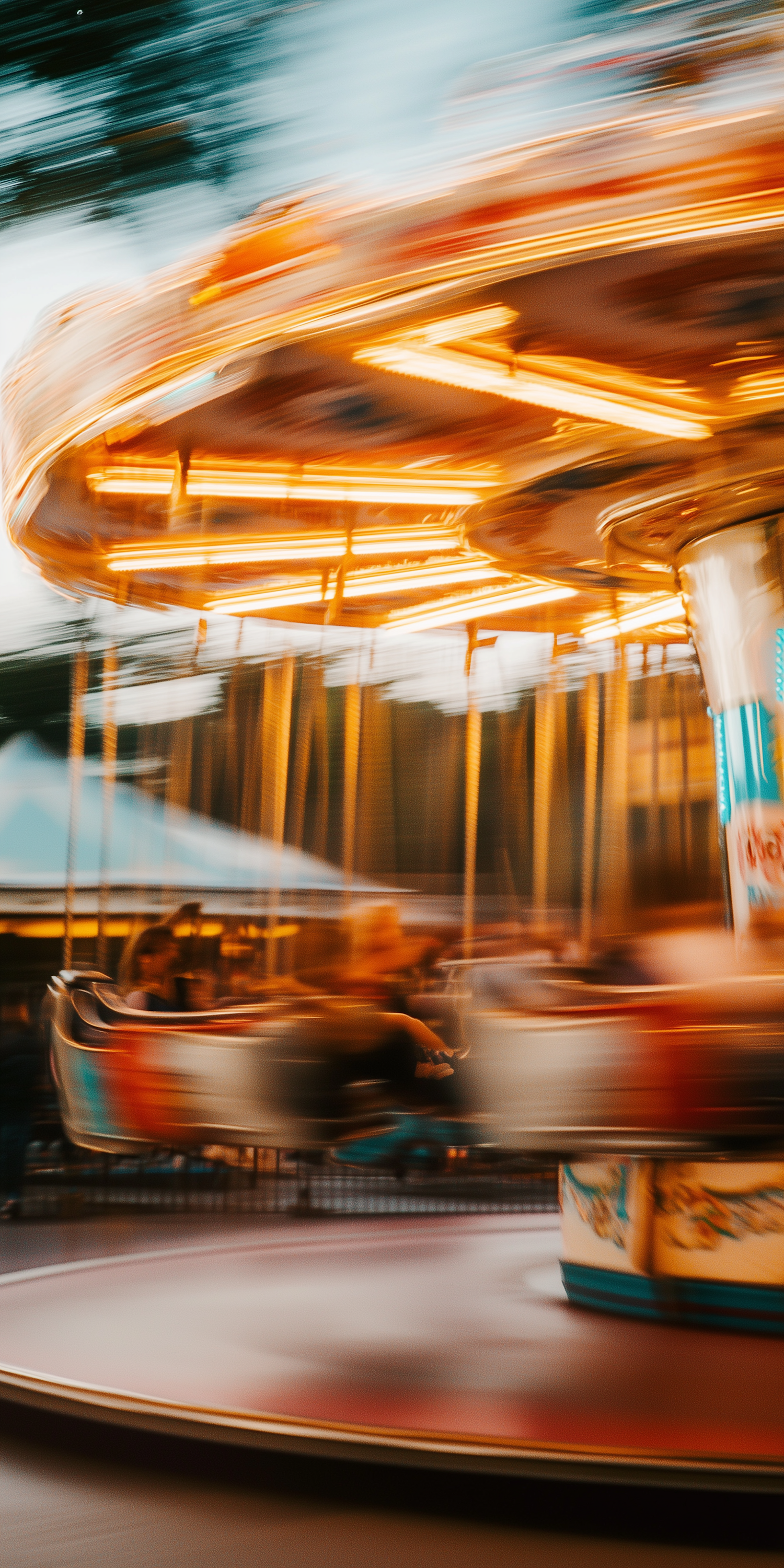 Blurred carousel in motion with warm lights and vibrant colors, capturing the excitement and energy of a fairground ride.