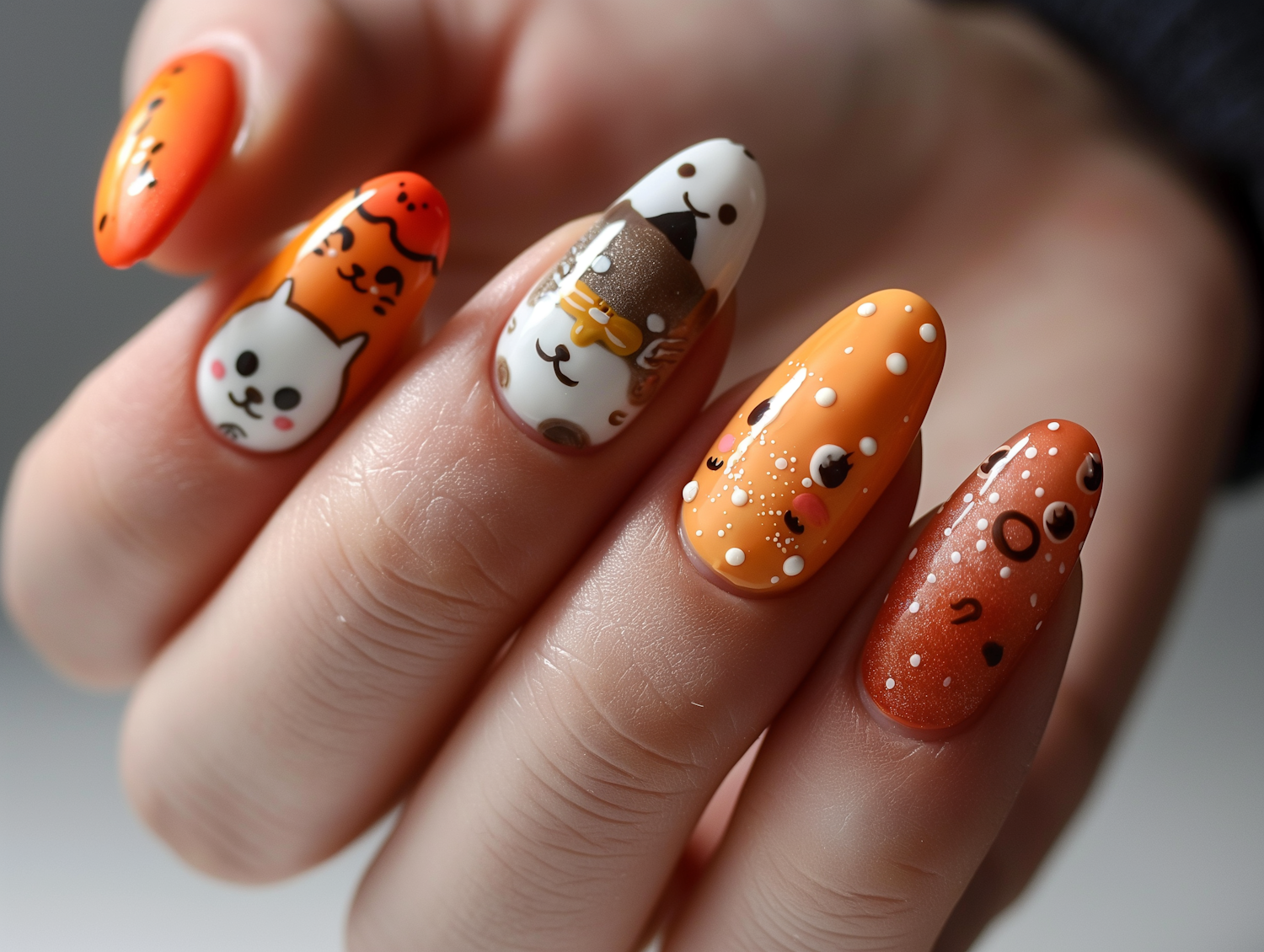 Cute cartoon cat nail art in vibrant orange and white shades, featuring playful designs and glossy finish.