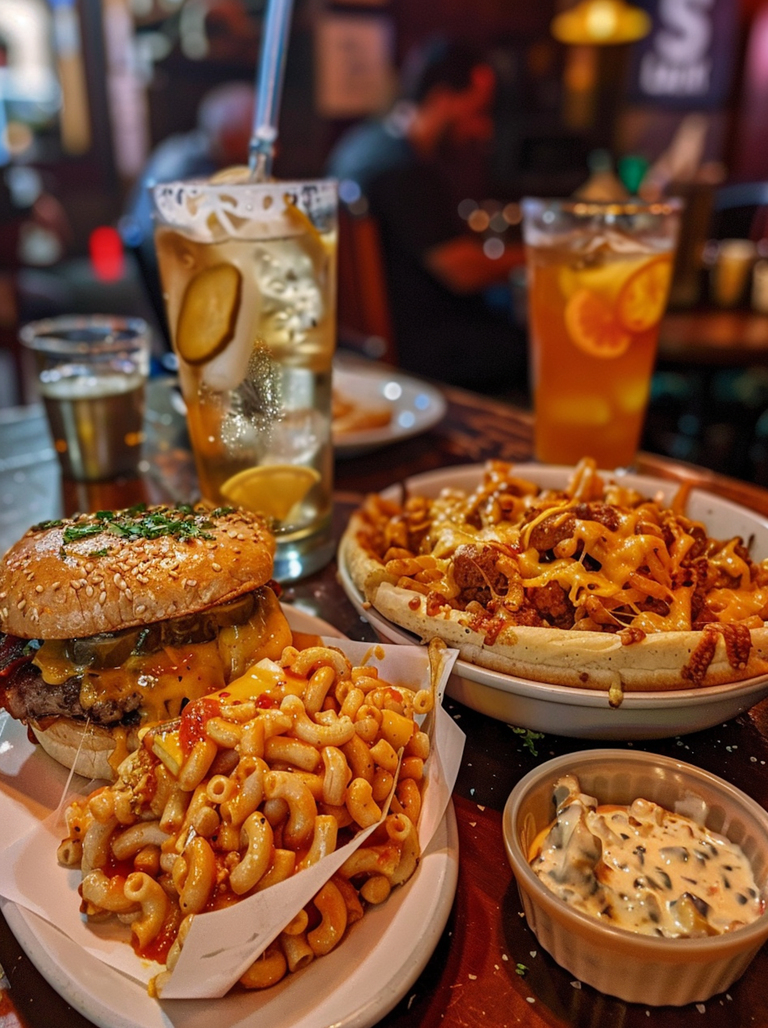 Delicious cheeseburger, mac and cheese, and loaded fries with refreshing drinks in a cozy restaurant setting.