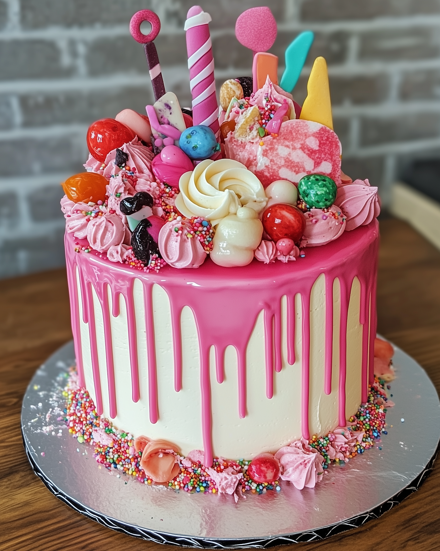 Colorful cake with pink drip, candy toppings, and sprinkles on a silver board. Perfect for celebrations and sweet tooths.