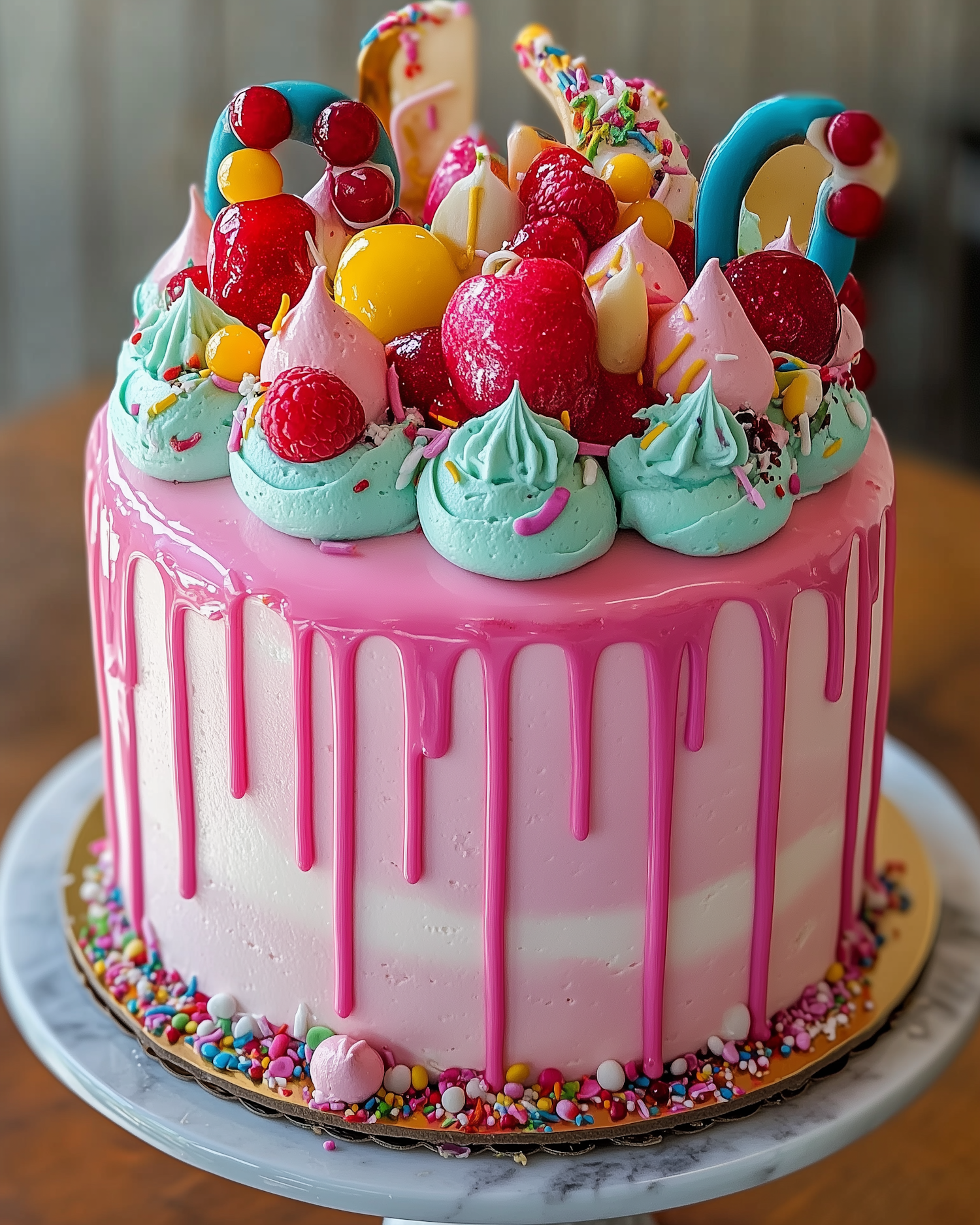 Vibrant cake with pink drip frosting, colorful candies, and meringue swirls on a marble stand. Perfect for celebrations.