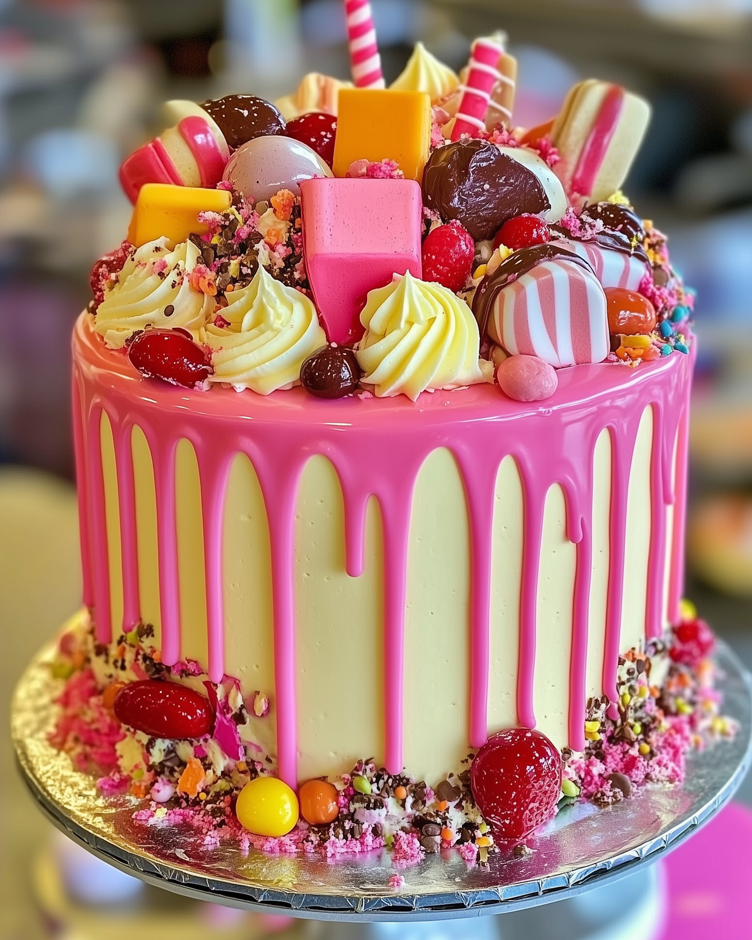 A colorful cake with pink drip icing, topped with assorted candies and chocolates, creating a whimsical and festive look.