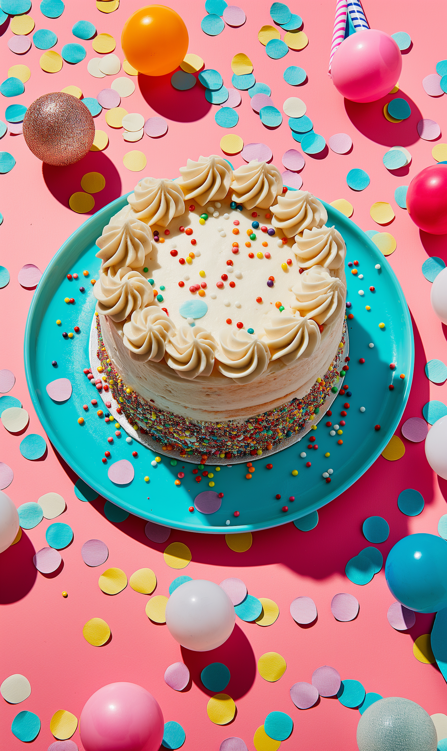 Colorful birthday cake with sprinkles on a blue plate, surrounded by balloons and confetti on a pink background.