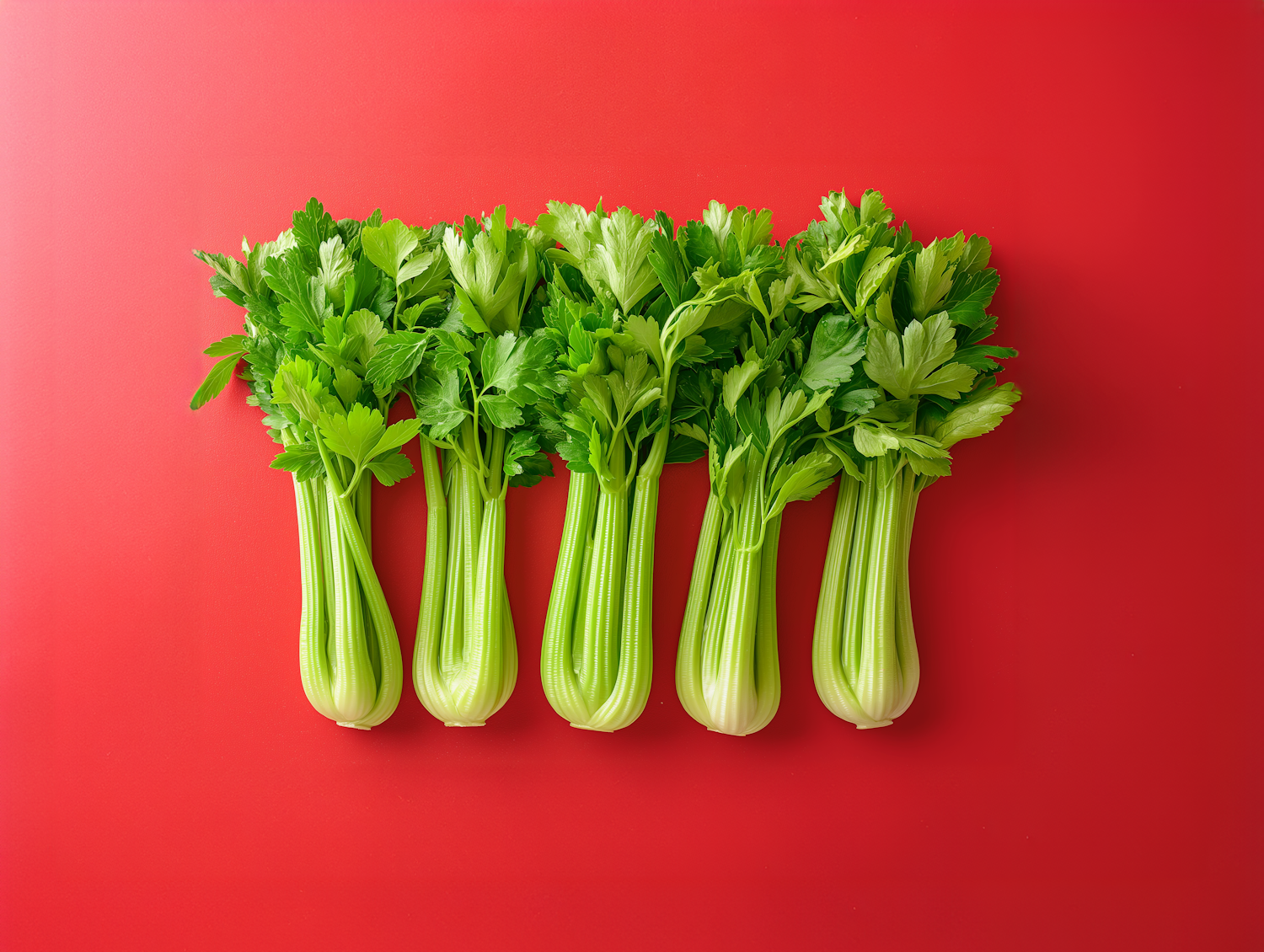 Five fresh celery bunches on a vibrant red background, showcasing crisp green stalks and lush leaves in a symmetrical arrangement.