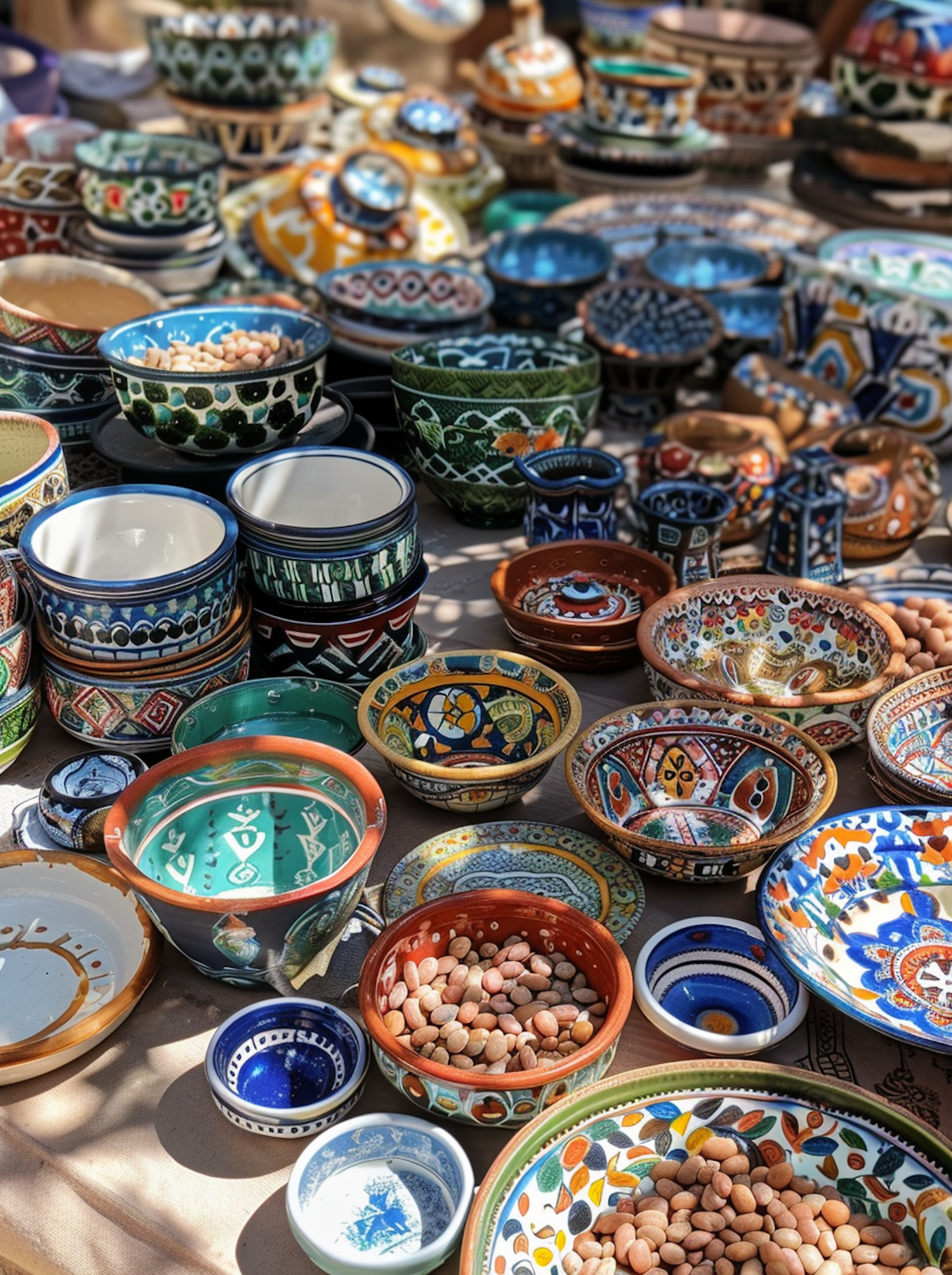 Colorful ceramic bowls with intricate patterns displayed on a table, some filled with beans, creating a vibrant artisan market scene.