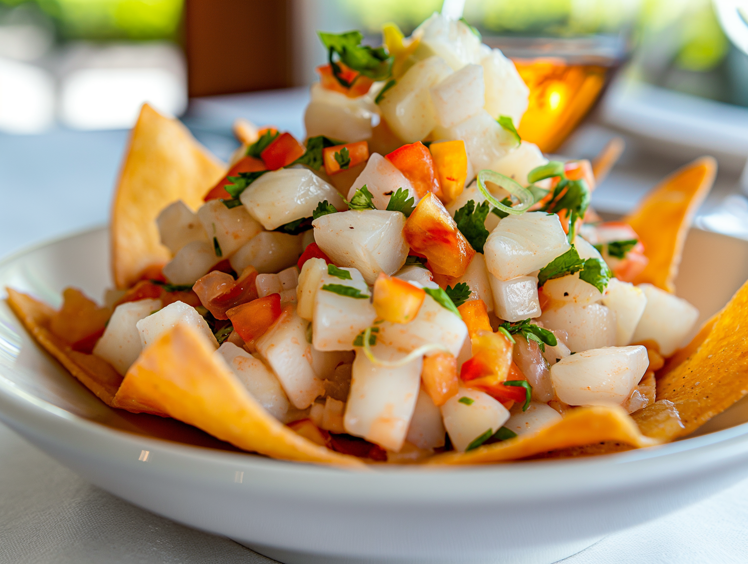 Delicious ceviche with diced fish, bell peppers, and cilantro on crispy tortilla chips, served in a white bowl.