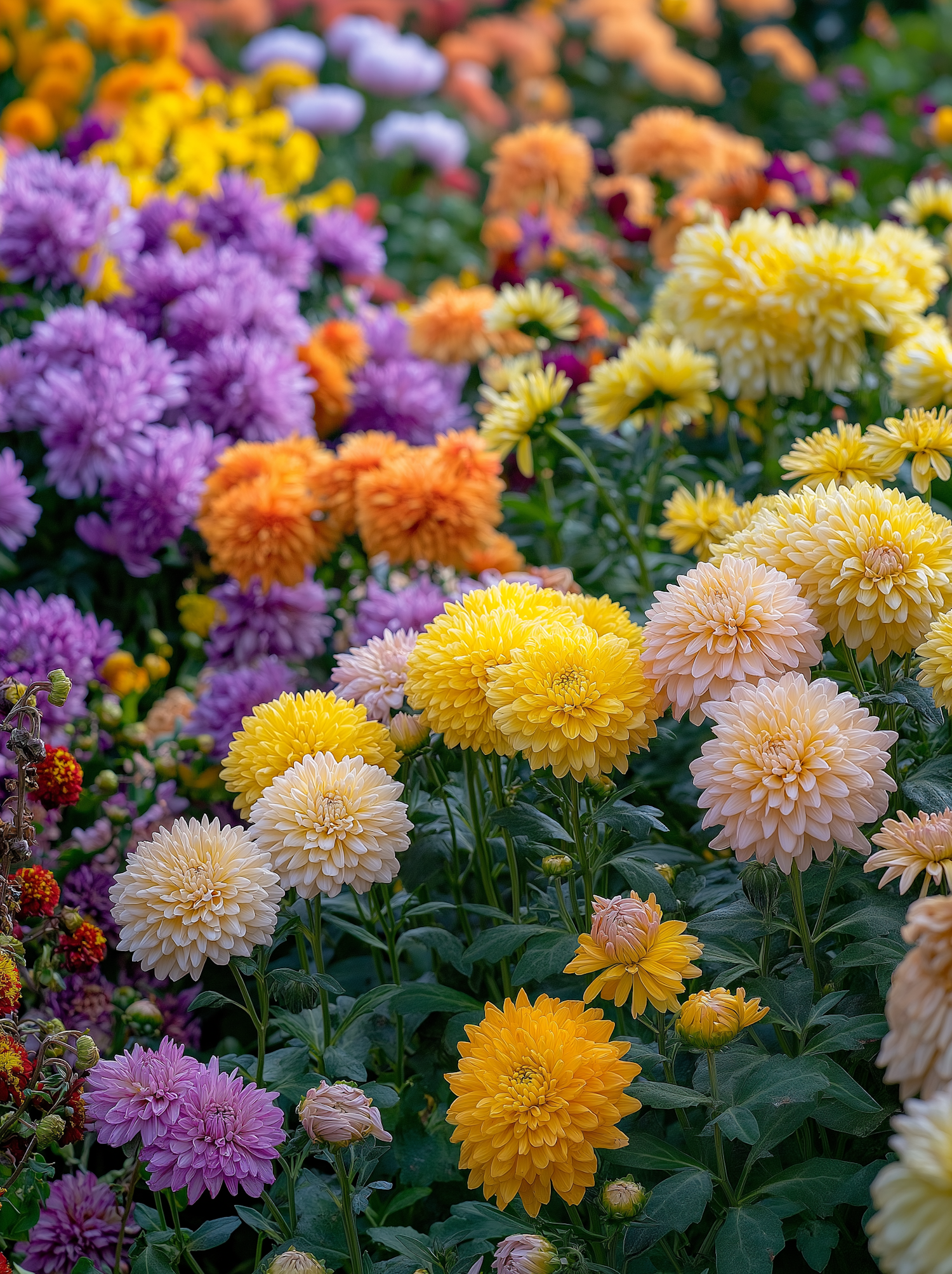 A vibrant garden with colorful flowers in yellow, peach, purple, and orange hues, creating a lively and harmonious scene.
