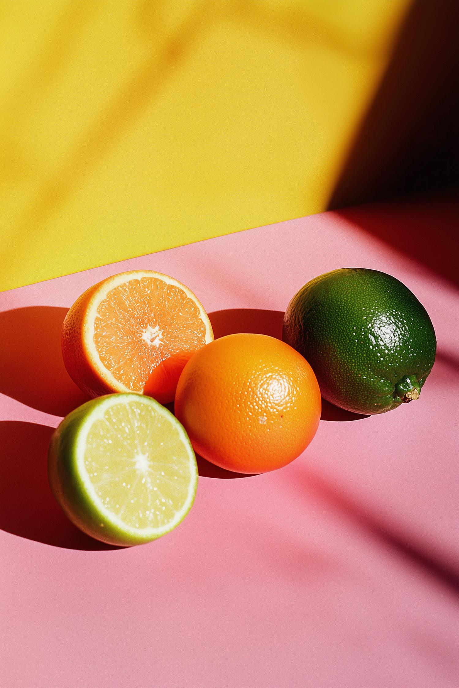 Vibrant citrus fruits on a colorful yellow and pink background, featuring oranges and limes with striking shadows.
