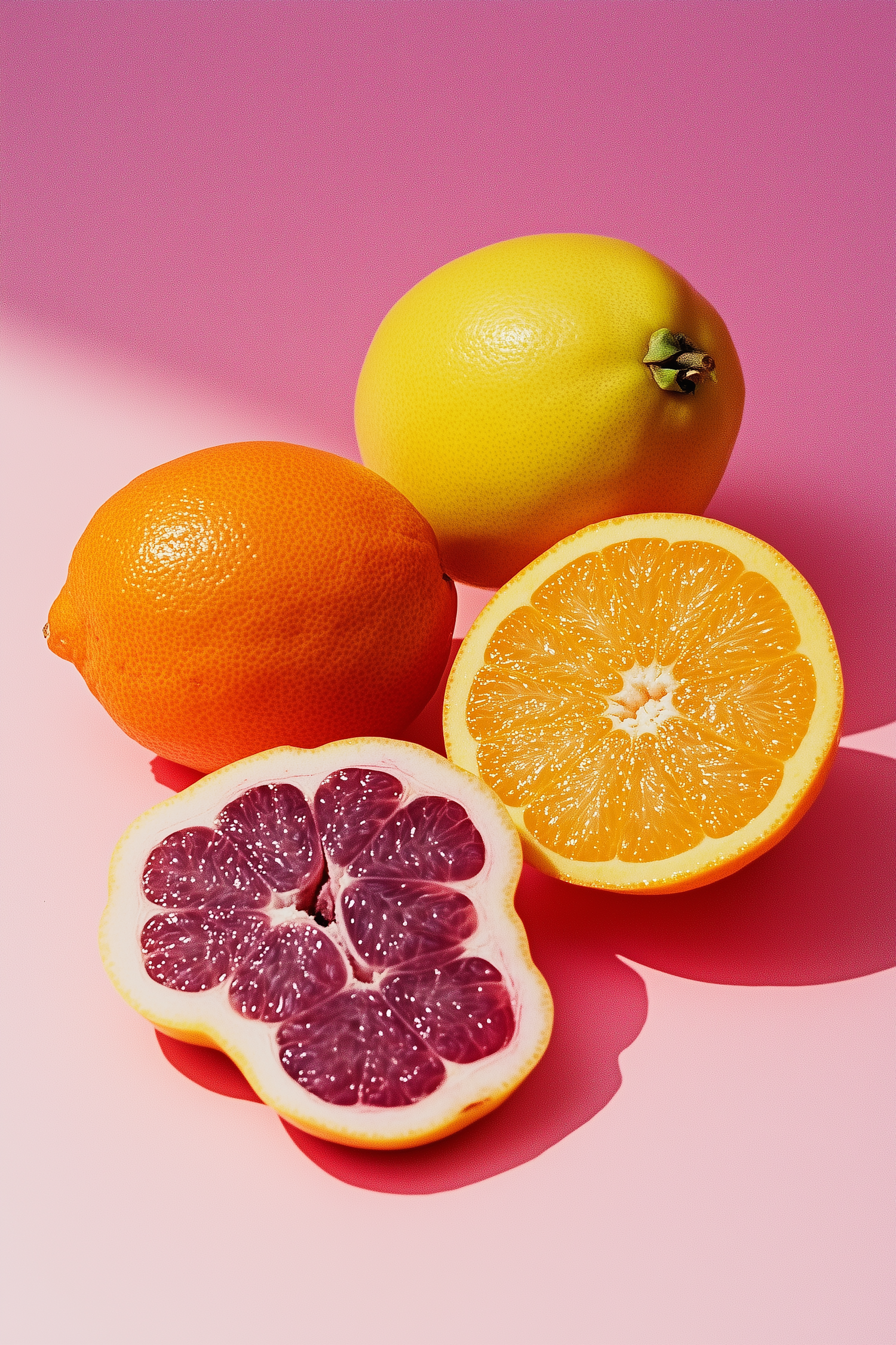 Vibrant citrus fruits on a pink background: lemon, orange, and grapefruit, showcasing fresh, juicy segments.