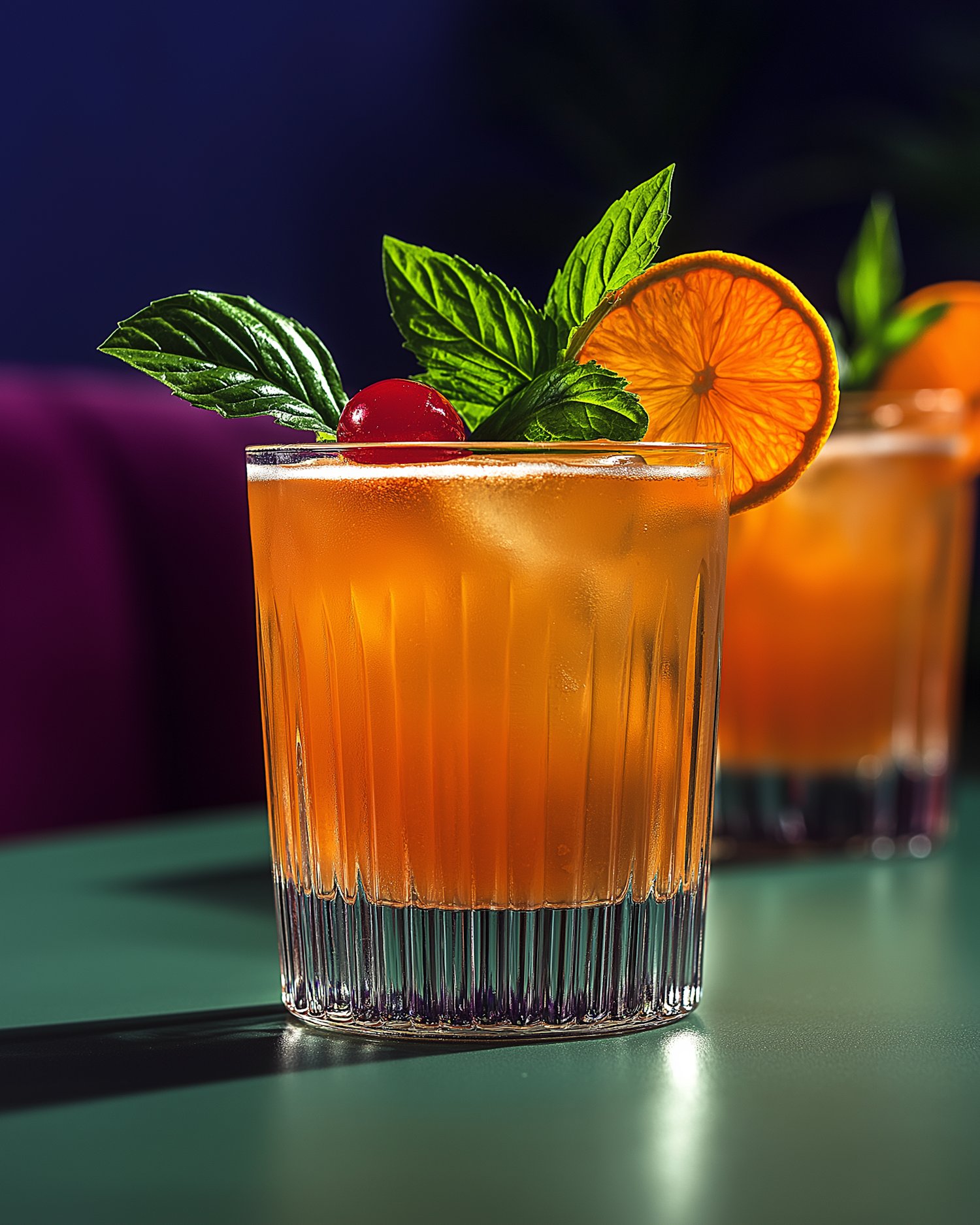 Vibrant orange cocktail with mint, cherry, and orange slice garnish in a textured glass on a green table.