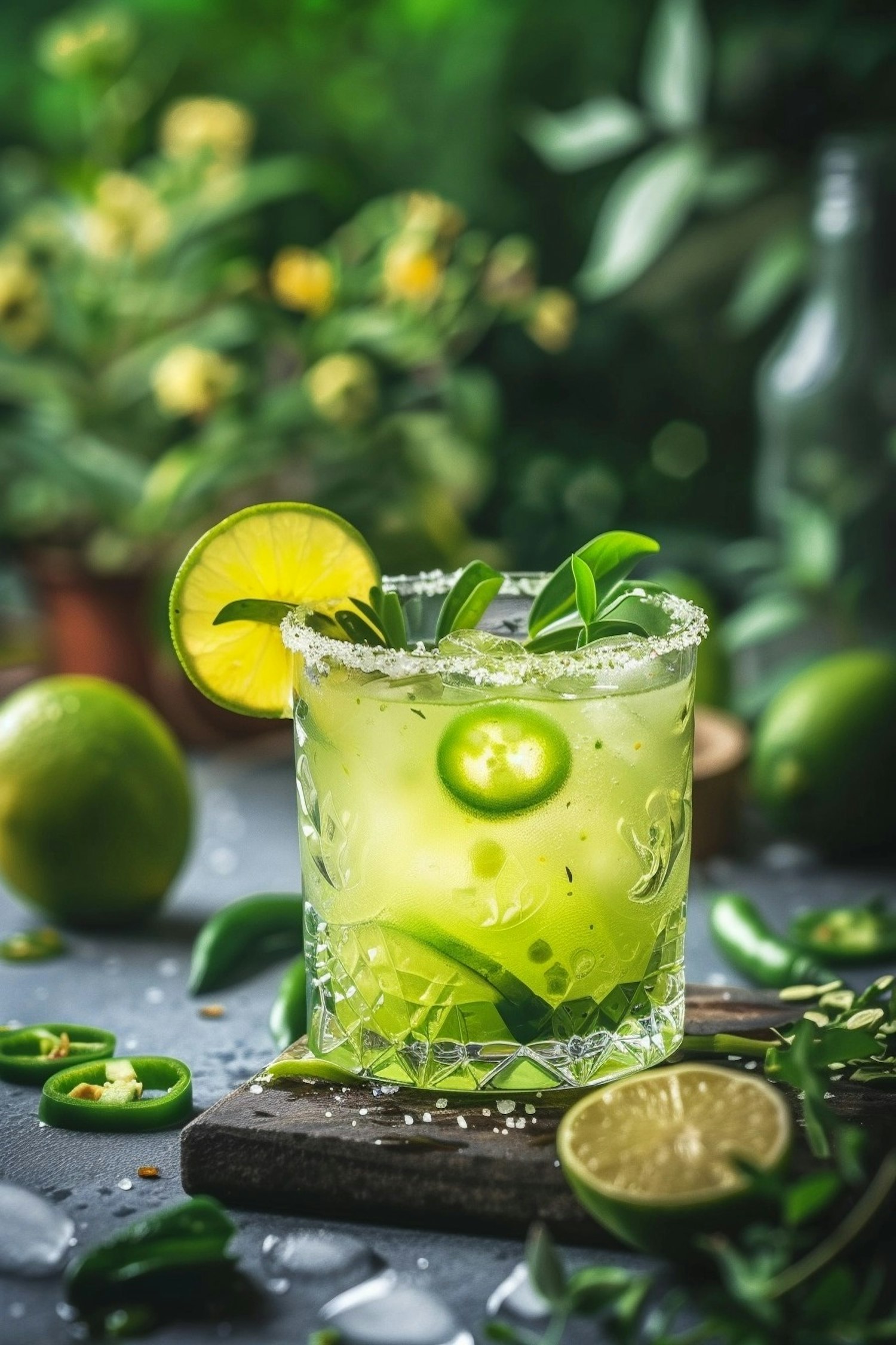Vibrant green cocktail with lime and jalapeño garnish, salt-rimmed glass, set against a lush green background.