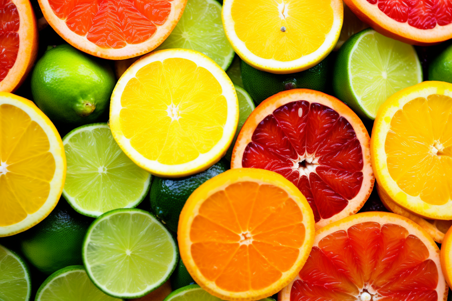 Vibrant citrus fruit slices in a colorful arrangement, featuring oranges, grapefruits, and limes. Refreshing and visually appealing.
