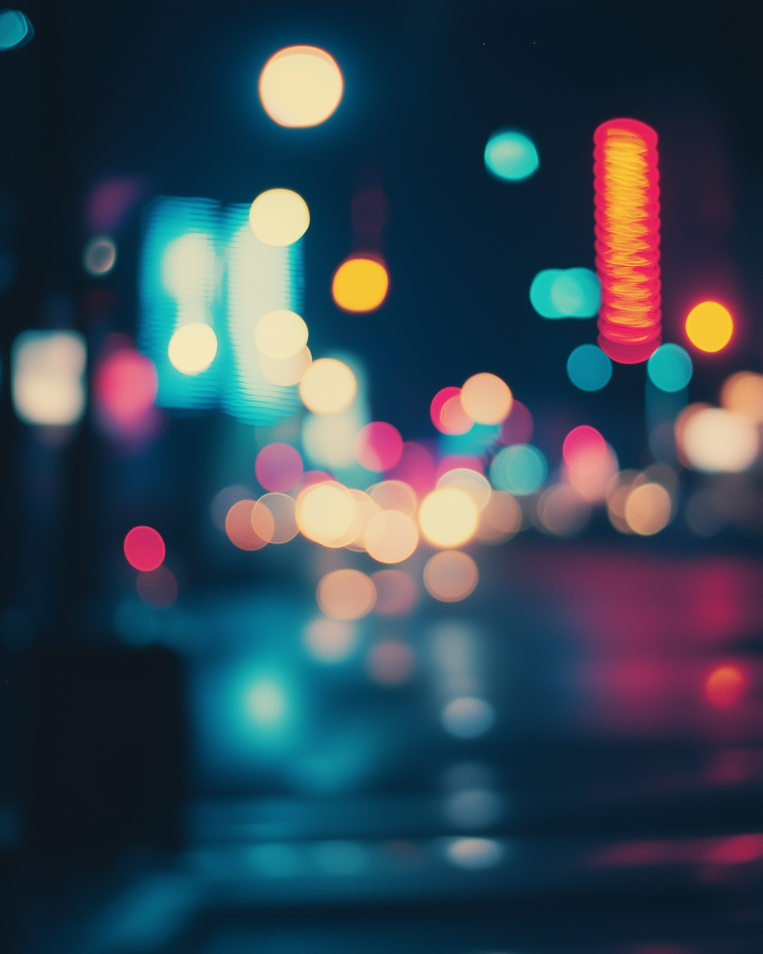 Dreamy bokeh of city lights at night with vibrant hues of blue, red, and yellow, evoking a lively urban nightlife vibe.
