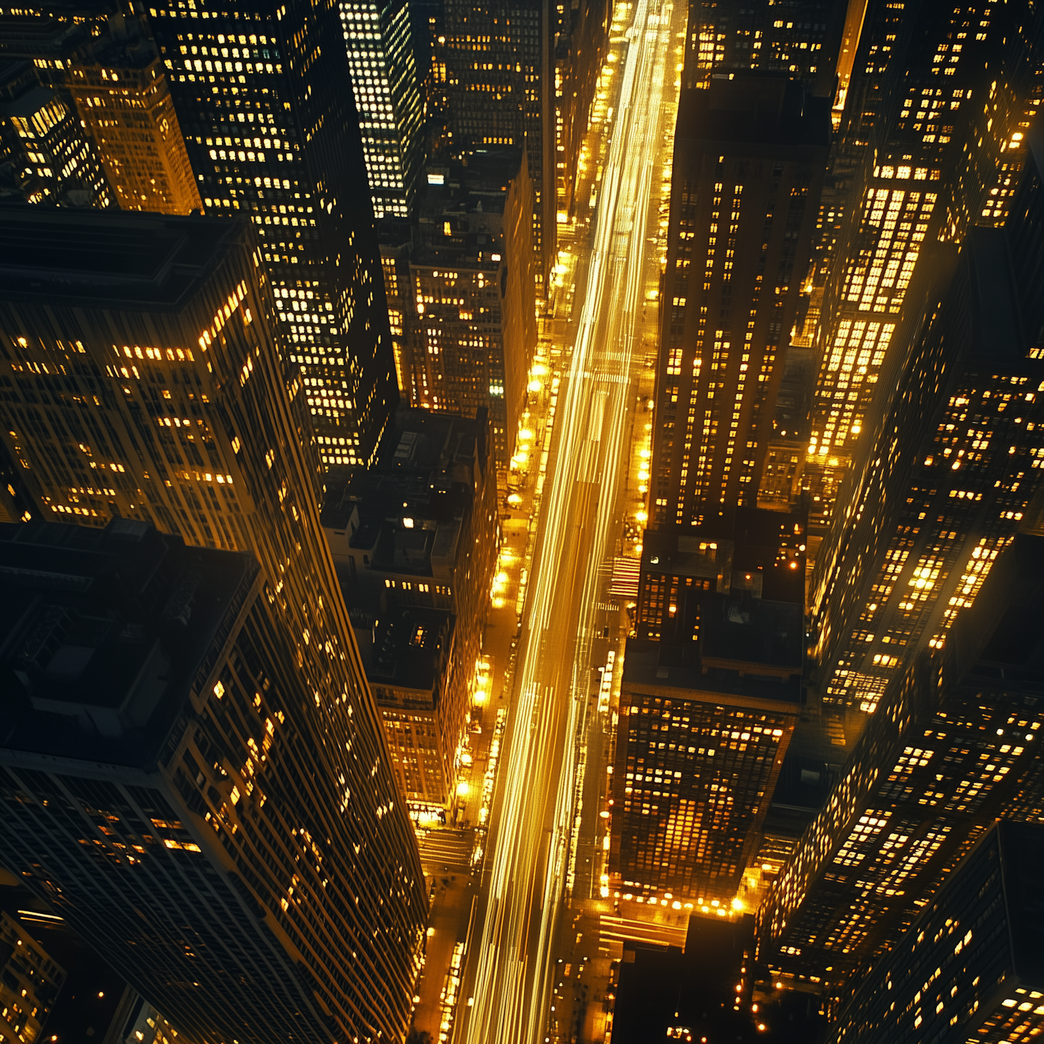 A stunning aerial night view of a city with glowing skyscrapers and light trails from traffic, creating a dynamic and golden urban scene.