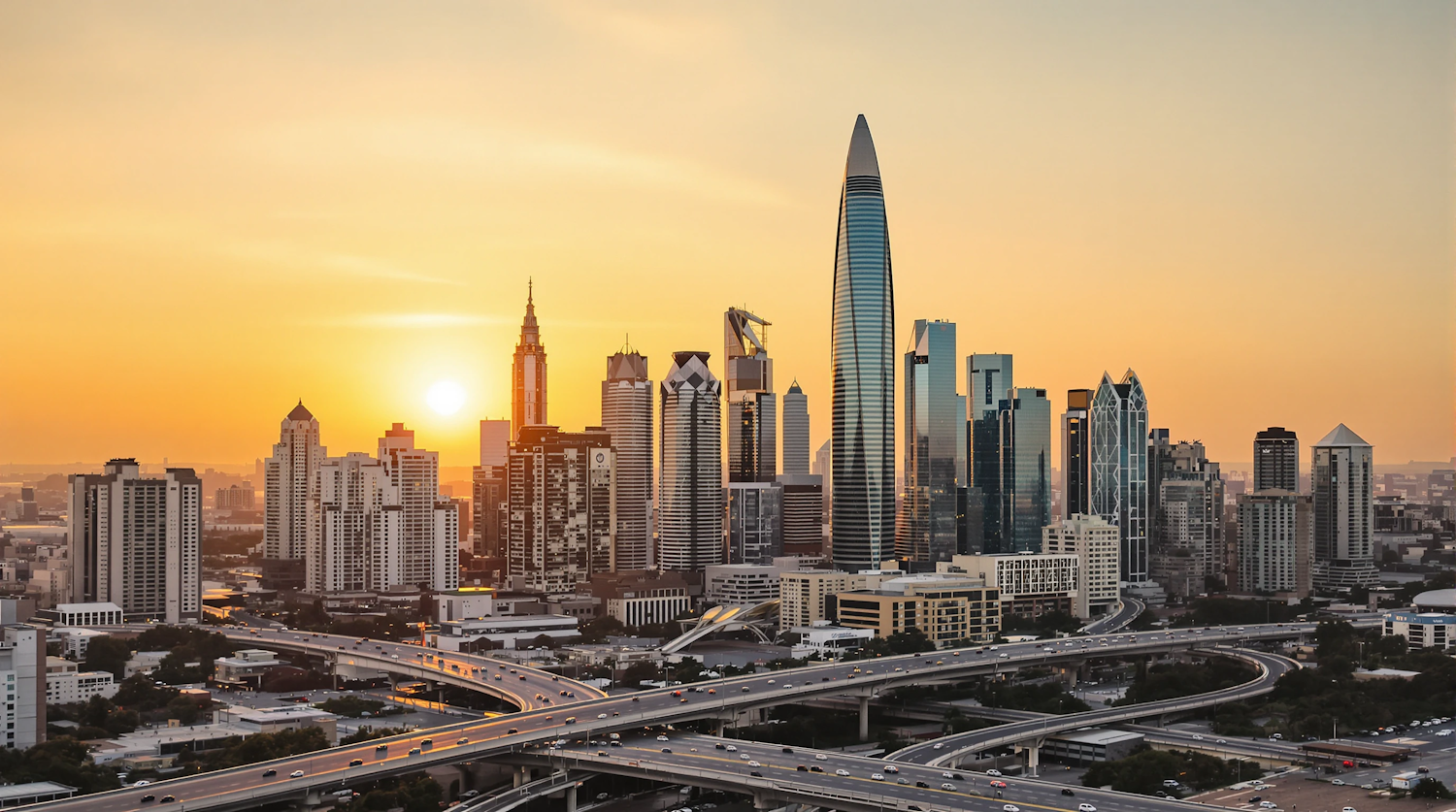 Stunning cityscape at sunset with modern skyscrapers and a network of highways, bathed in a warm orange glow.