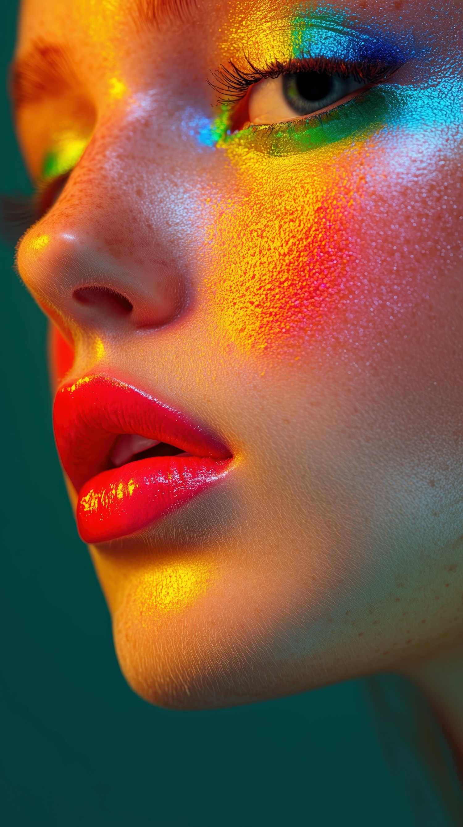 Close-up of a woman's face with vibrant rainbow lighting, glossy red lips, and shimmering green-blue eye makeup on fair, freckled skin.