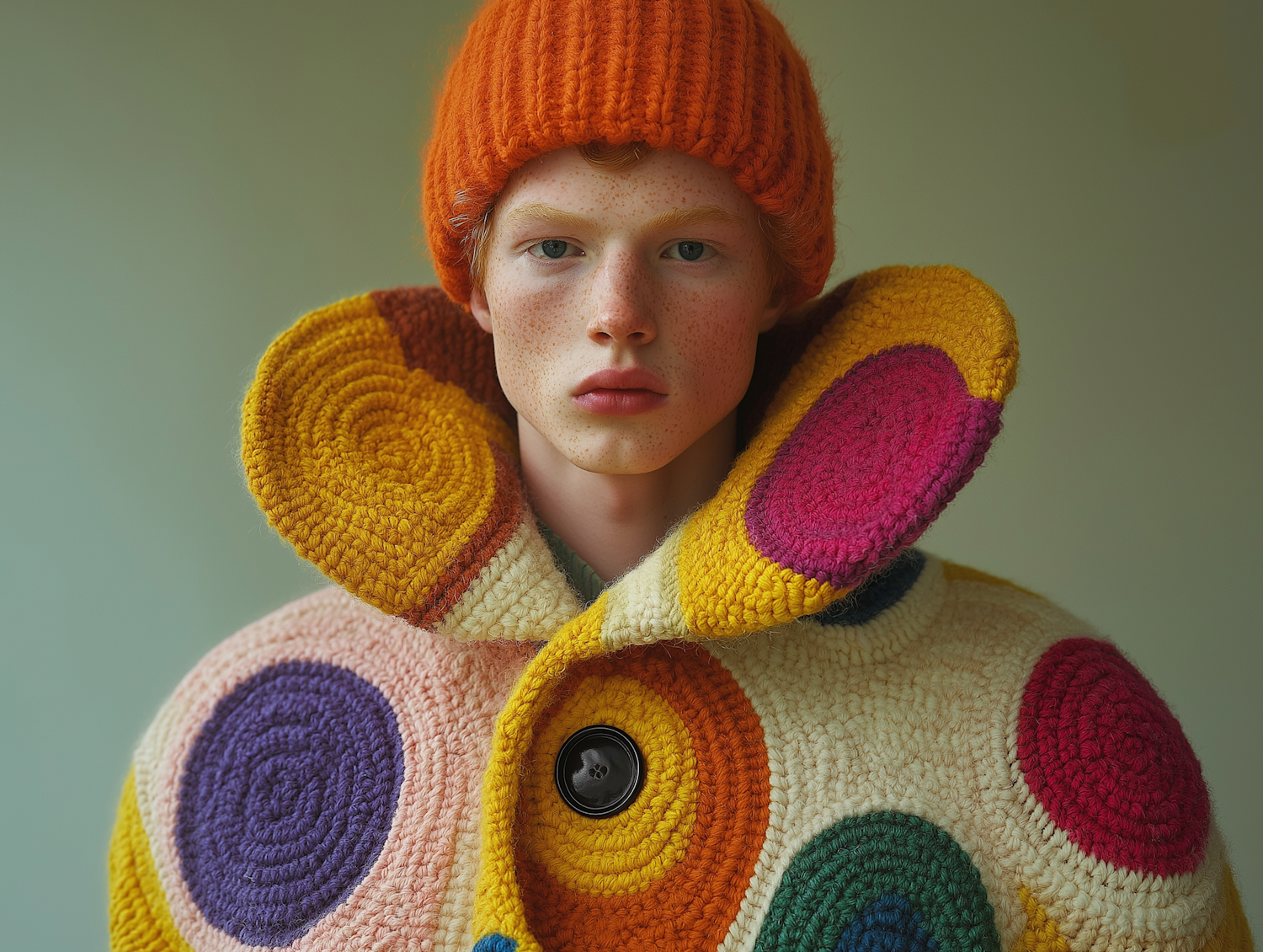 A young person in a colorful, textured coat with circular patterns and an orange beanie, set against a muted green background.