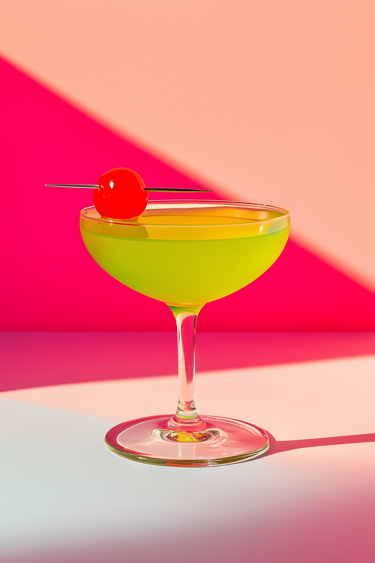 Bright yellow-green cocktail in a coupe glass with a red cherry garnish, set against a bold pink and peach gradient background.